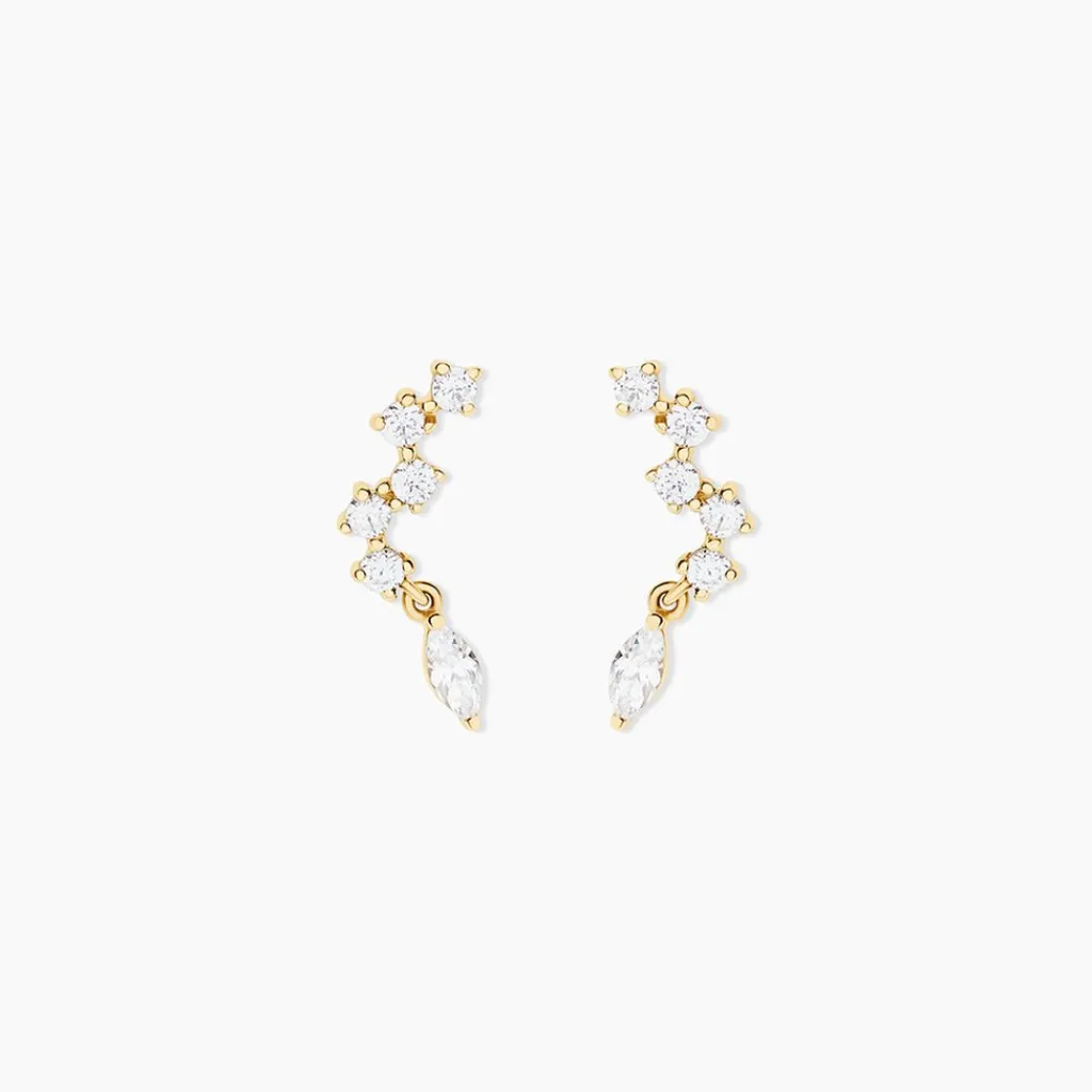 Boucles D’Oreilles Puces Or Jaune 375/1000 Oxyde De Zirconium Navettes Et Rondes Sertis Griffes