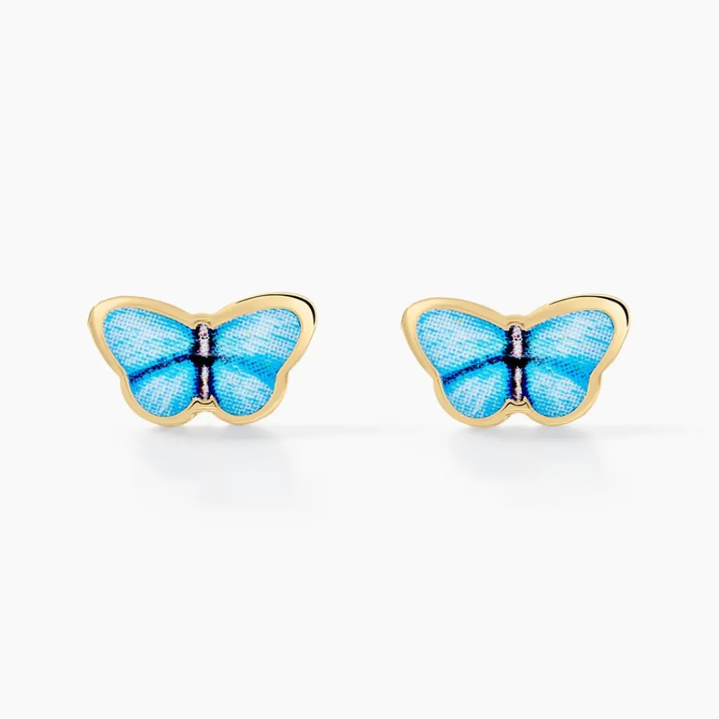 Boucles D’oreilles Or Jaune 375/1000 Puces Papillon Tropical Bleu