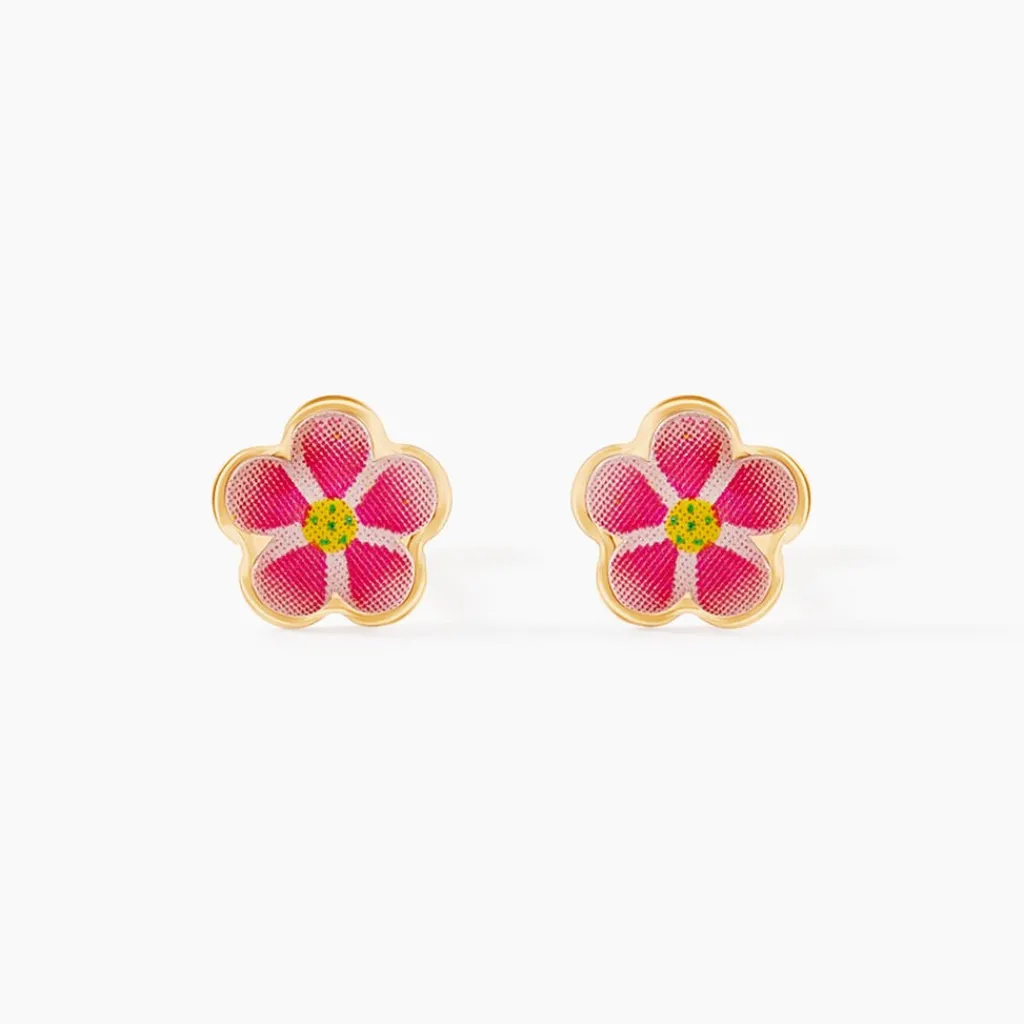 Boucles D’oreilles Or Jaune 375/1000 Fleur Smalto Rose
