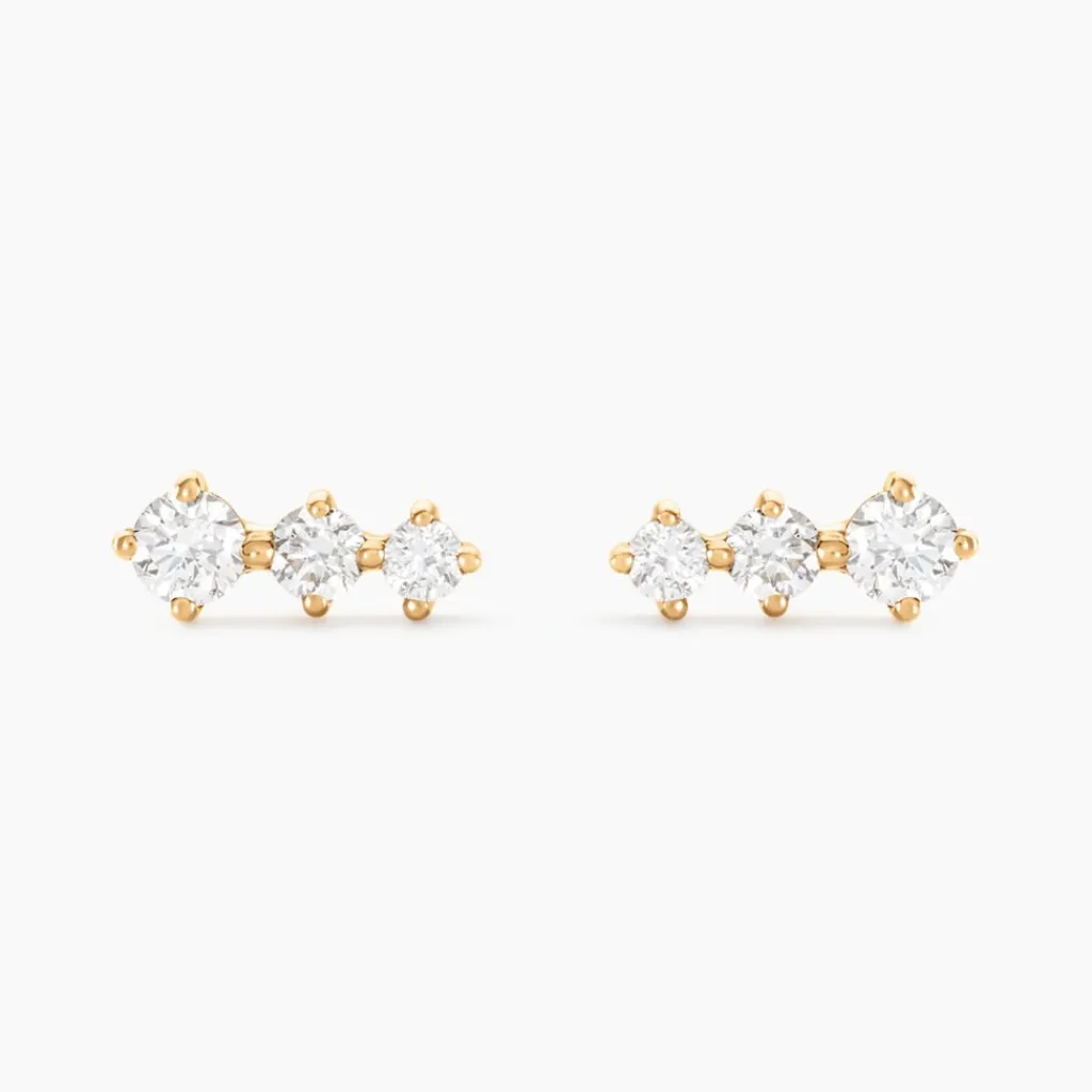 Boucles D’oreilles Puces Or Jaune 375/1000 Trilogie Diamants Synthetiques 0.24cts Sertis Griffes