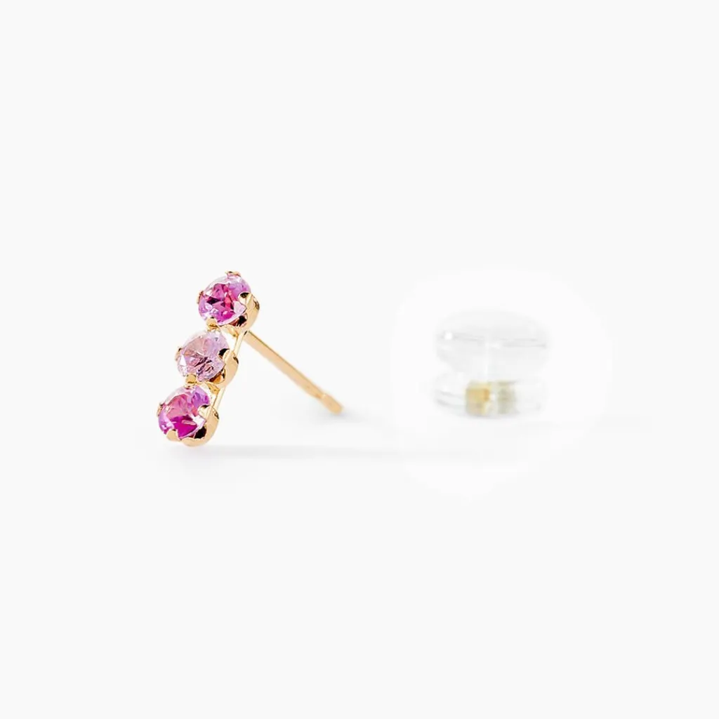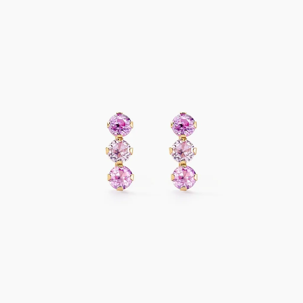 Boucles D’oreilles Puces Or Jaune 375/1000 Trilogie Oxydes De Zirconium Fuschia Et Rose Serti Griffes
