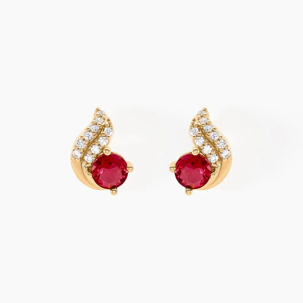 Boucles D’oreilles Puces Plaqué Or Jaune Vagues Pavages Oxydes De Zirconium Pierres Rouges