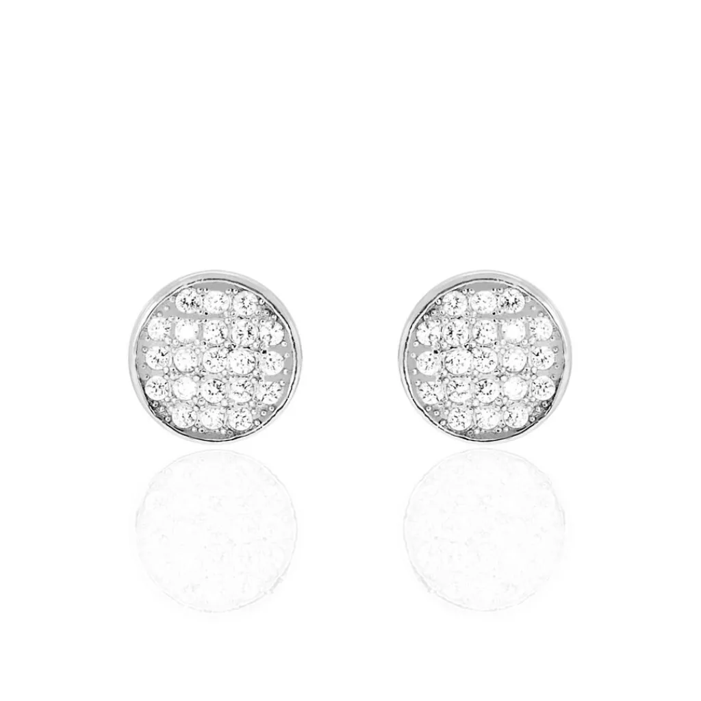 Boucles D’oreilles Puces Argent Blanc 925/1000 Forme Pastille Pavage Oxydes De Zirconium