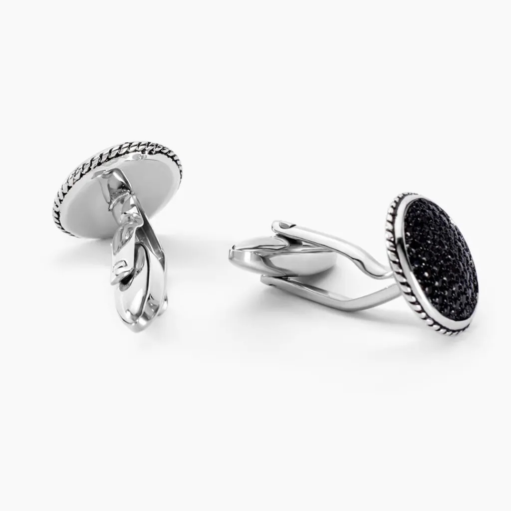 Boutons De Manchette Acier Inoxydable Bicolore Pastilles Noires Effet Empierre