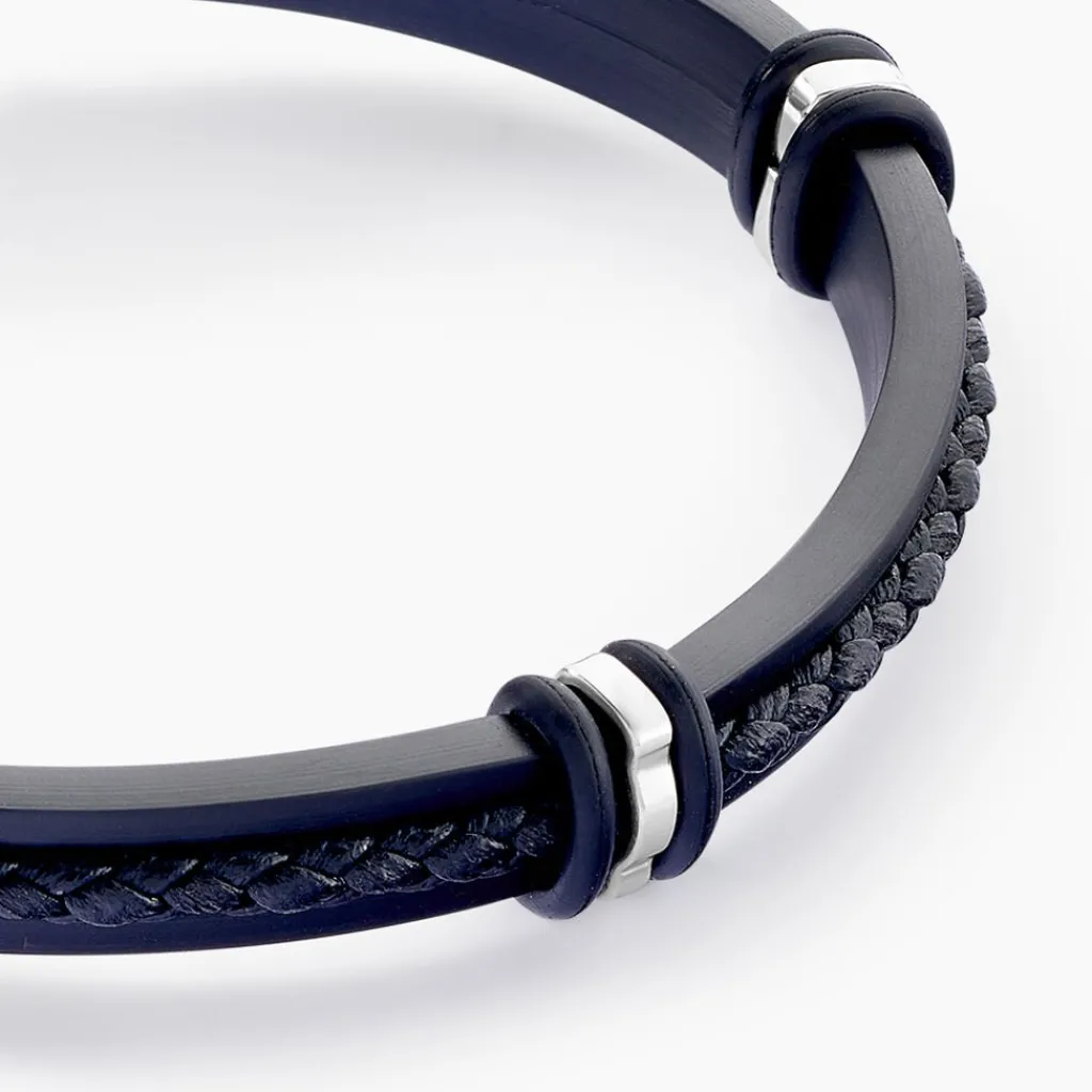Bracelet Acier Inoxydable Blanc Caoutchouc Et Synthetique Tressé Noir 21cm