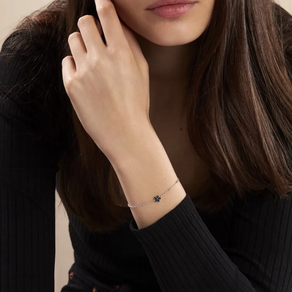 Bracelet Argent 925/1000 laldilon Fleur Serti Griffes Oxydes De Zirconium Bleus Maille Boules 19cm