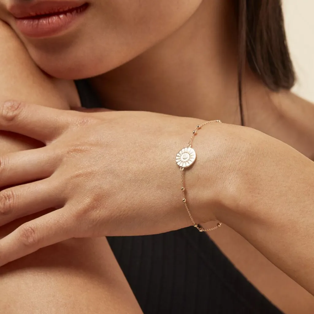 Bracelet Plaqué Or Jaune Forme Pastille Motif Soleil Effet Perle Oxyde De Zirconium 18cm