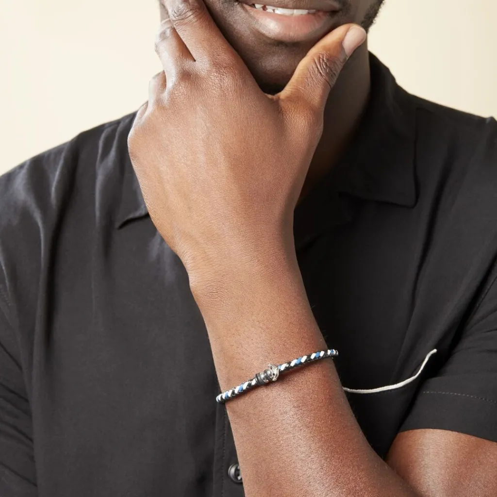 Bracelet Acier Inoxydable Blanc Tresse Synthetique Blanc Noire Et Bleue 21cm