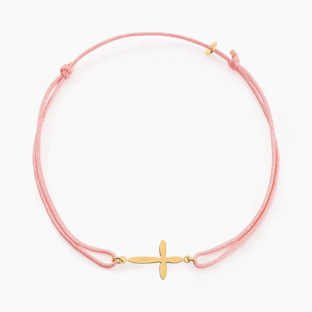 Bracelet Or Jaune 375/1000 Croix Sur Cordon Nylon Ajustable Rose