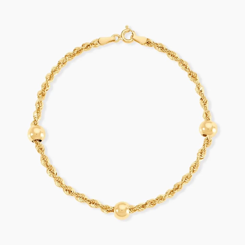 Bracelet Or Jaune 750/1000 Maille Corde Largeur 2,7Mm Avec 3 Boules 5Mm 18Cm