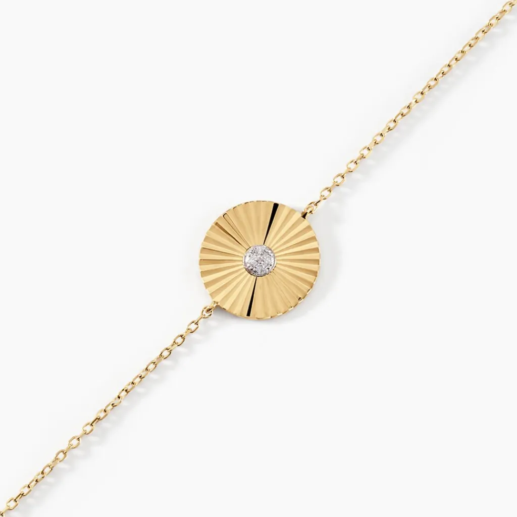 Bracelet Or Jaune 375/1000 Pastille Diamantee Pavage Diamants Maille Forcat 16+2cm
