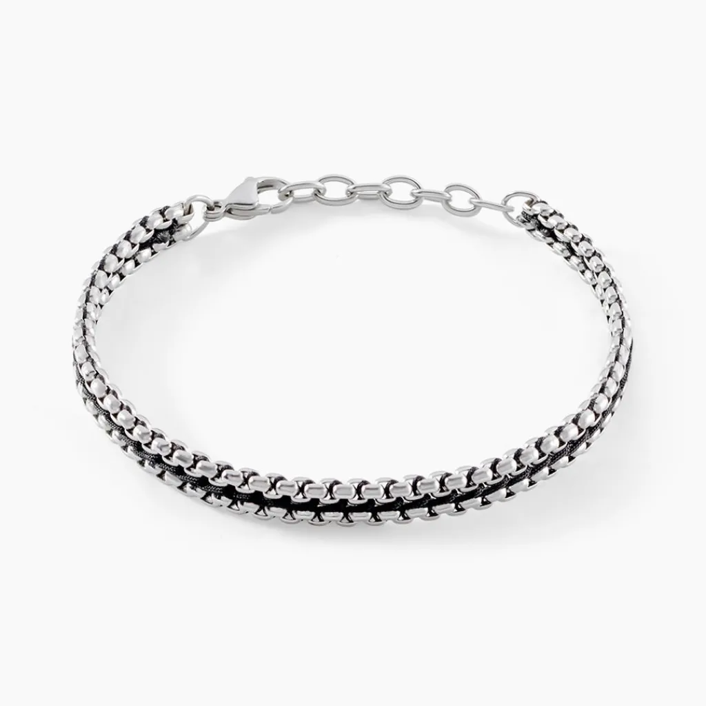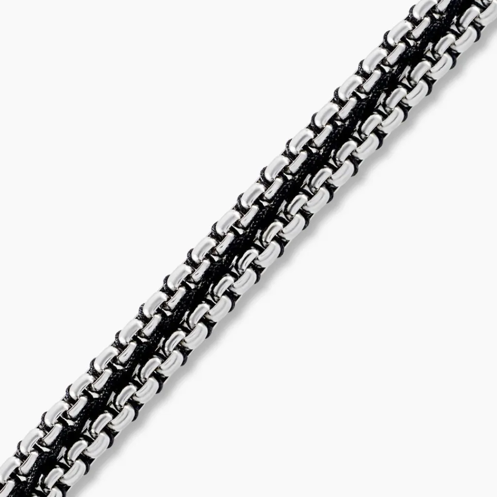Bracelet Acier Inoxydable Blanc Double Maille Vénitienne Cordon Central Noir Largeur 7.5mm 19+3cm