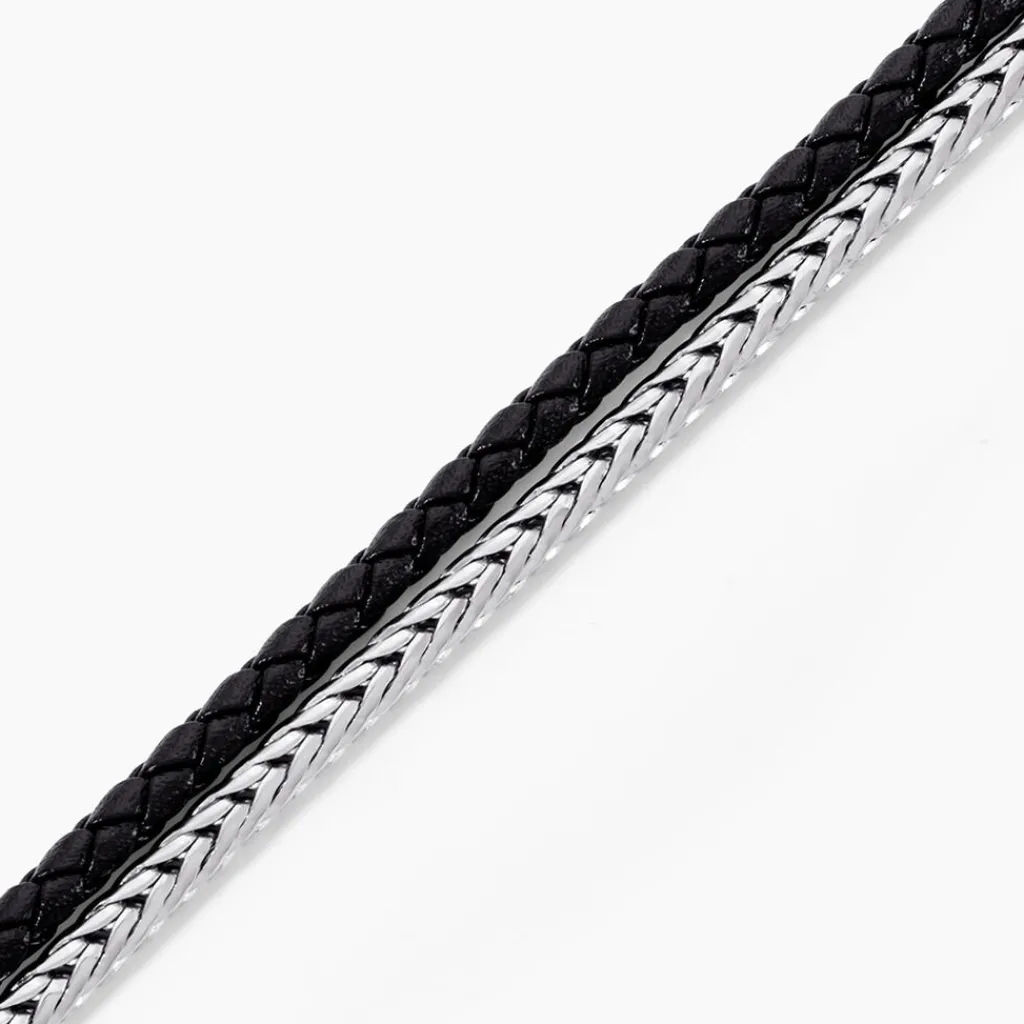 Bracelet Acier Inoxydable Blanc Cordon Tresse Cuir De Vache Noir Et Maille Palmier Largeur 4Mm 21Cm