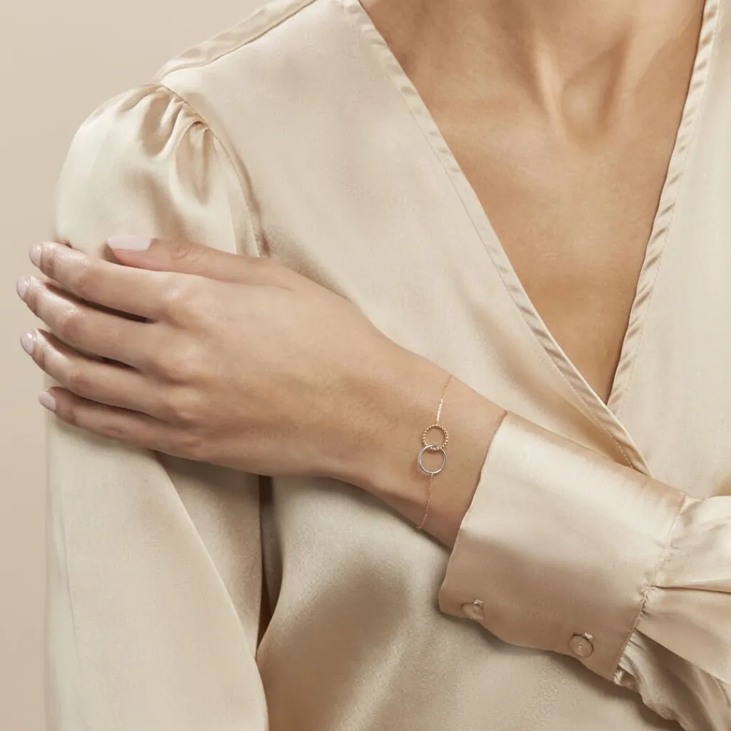 Bracelet Or Bicolore 375/1000 Double Cercles Ajoures Effet Perle Et Lisse Maille Jaseron 18cm