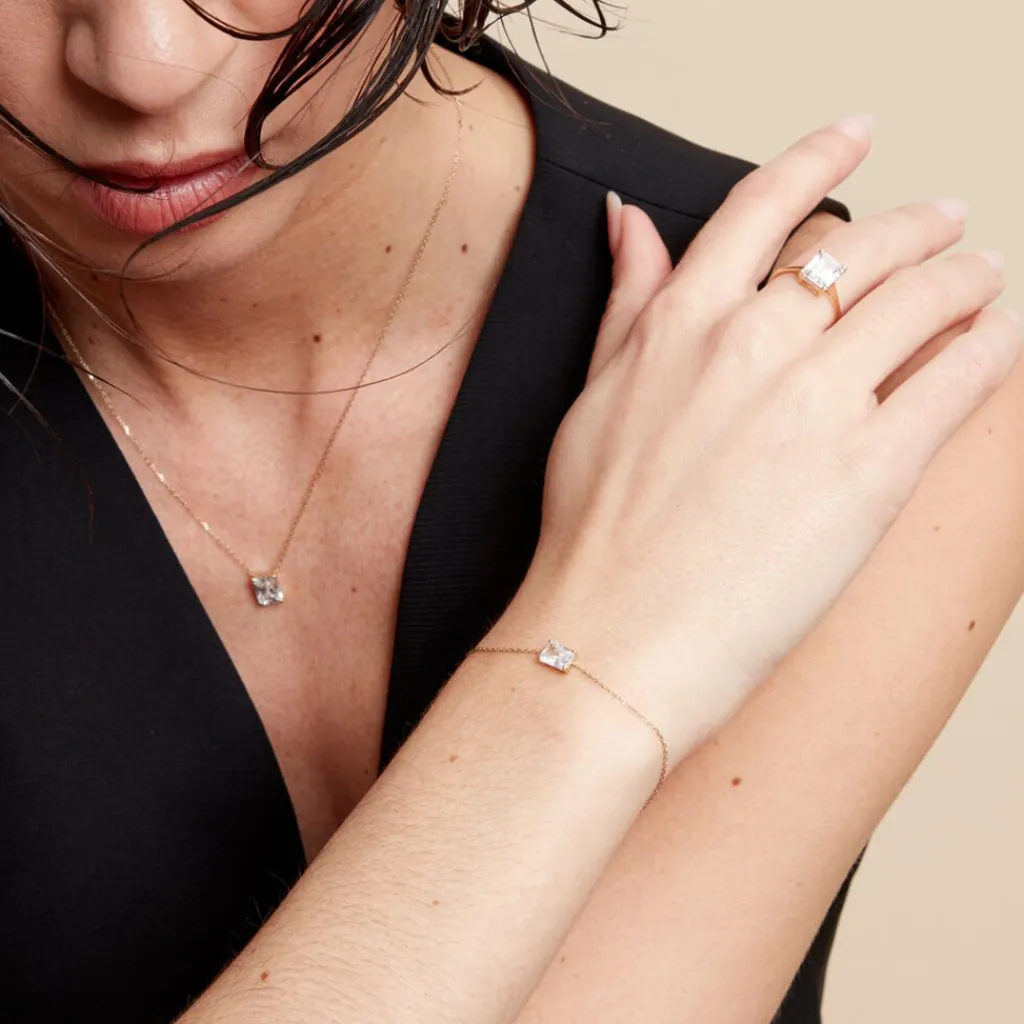 Bracelet Or Jaune 375/1000 Rectangle Oxyde De Zirconium Octogone Serti Griffes Maille Forçat 16+2cm