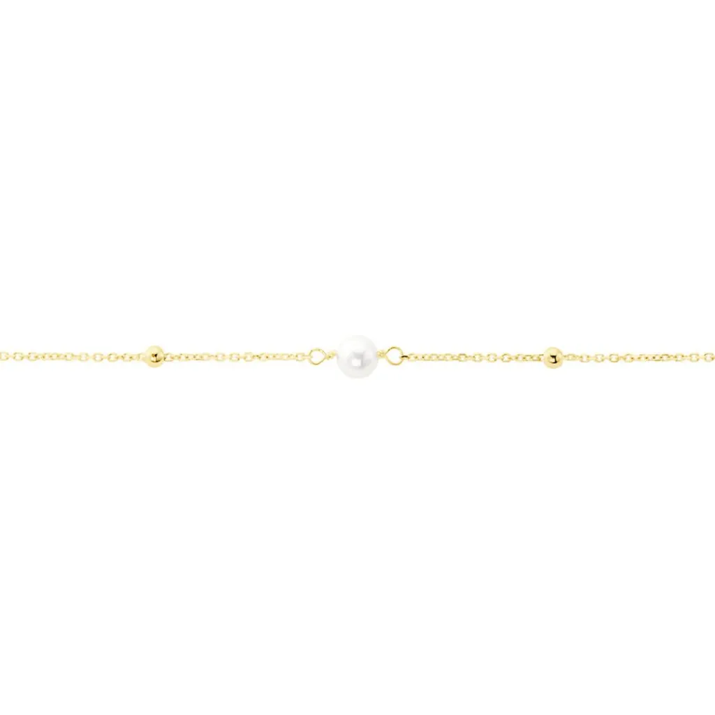 Bracelet Or Jaune 375/1000 3 Perles De Culture Rondes Blanches 3.5/4mm Alternees 4 Boules Lisses Maille Forcat 16+2cm
