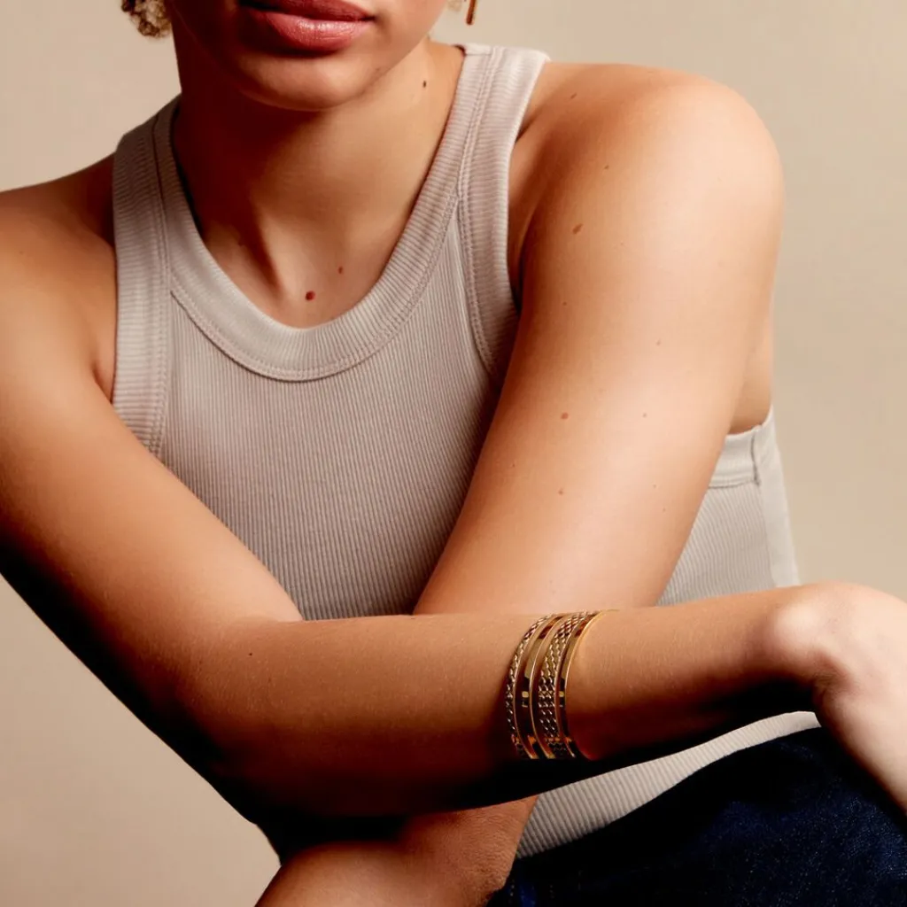 Bracelet Manchette Acier Inoxydable Jaune Ouvert 4 Anneaux Larges Ajoures Alternes Lisses Et Reptile Pm