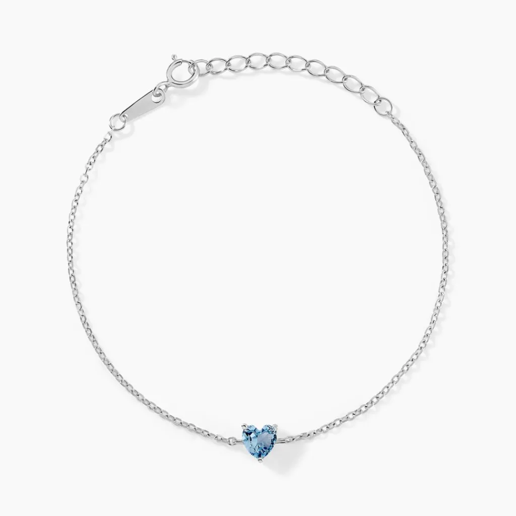 Bracelet Argent 925/1000 C艙ur Serti Griffes Oxyde De Zirconium Bleu Maille Forcat 15+3cm
