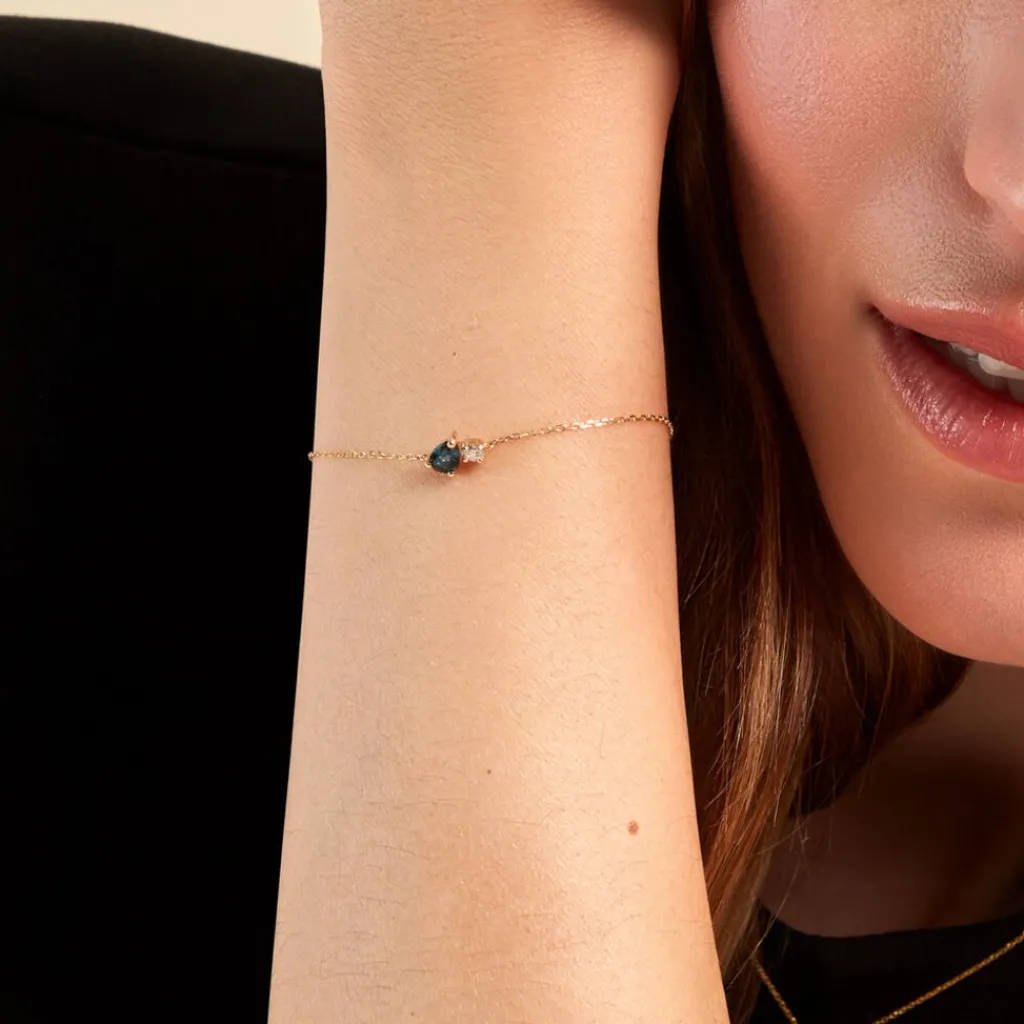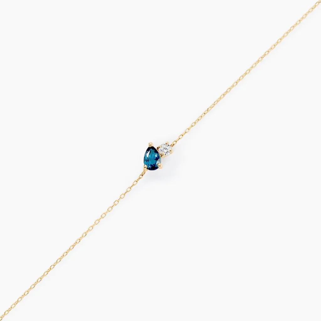 Bracelet Or Jaune 375/1000 Gouttes Topaze Bleu London Et Oxyde De Zirconium Serti Griffes Maille Forcat 16+2cm