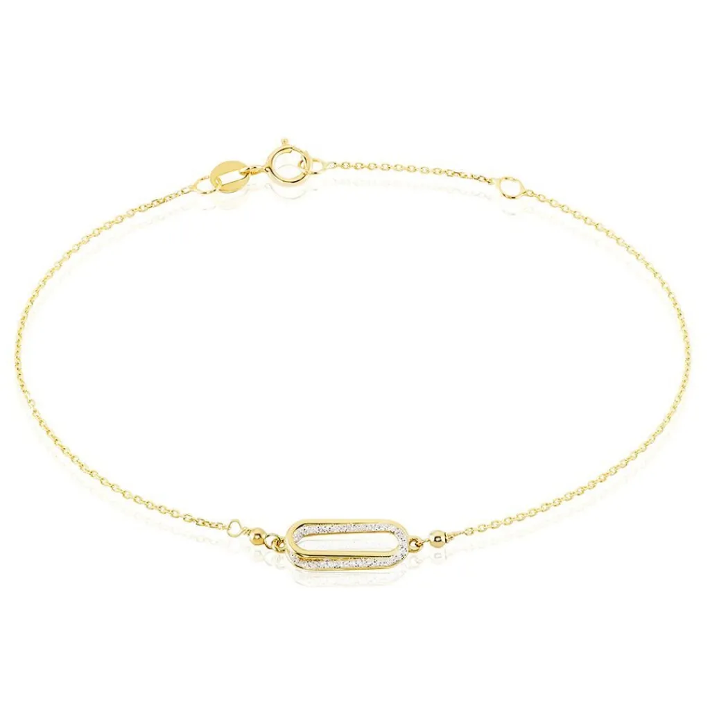 Bracelet Or Jaune 375/1000 Double Rectangles Entrelaces Dont Un Glitter Argente Maille Jaseron 16+2cm
