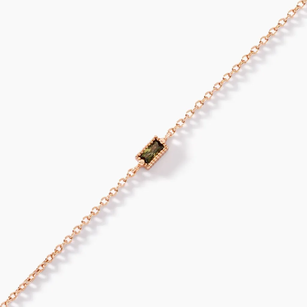 Bracelet Court Argent Rose 925/1000 Oxyde De Zirconium Vert Forme Baguette Entourage Perlé Maille Forçat 13+3cm