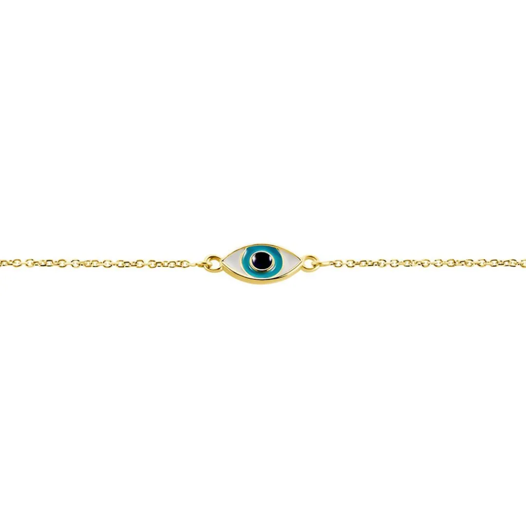 Bracelet Or Jaune 375/1000 Oeil Email Turquoise Et Blanc Maille Jaseron 16+2cm