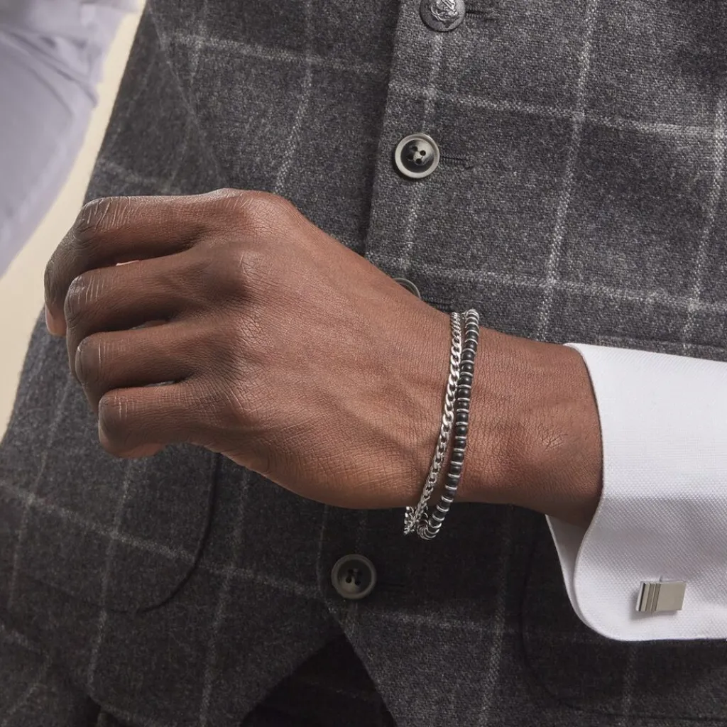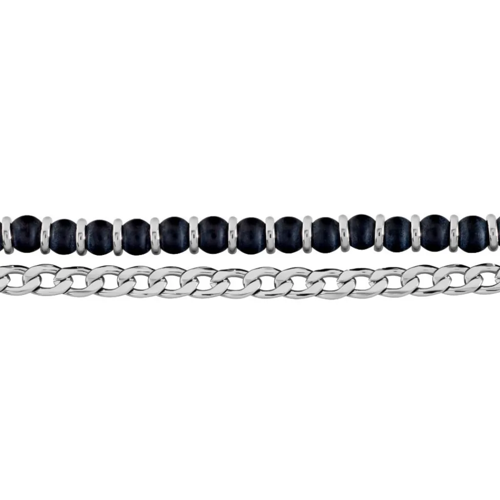 Bracelet Acier Inoxydable Noir Et Gris Double Chaine Gourmette Et Boules 21cm