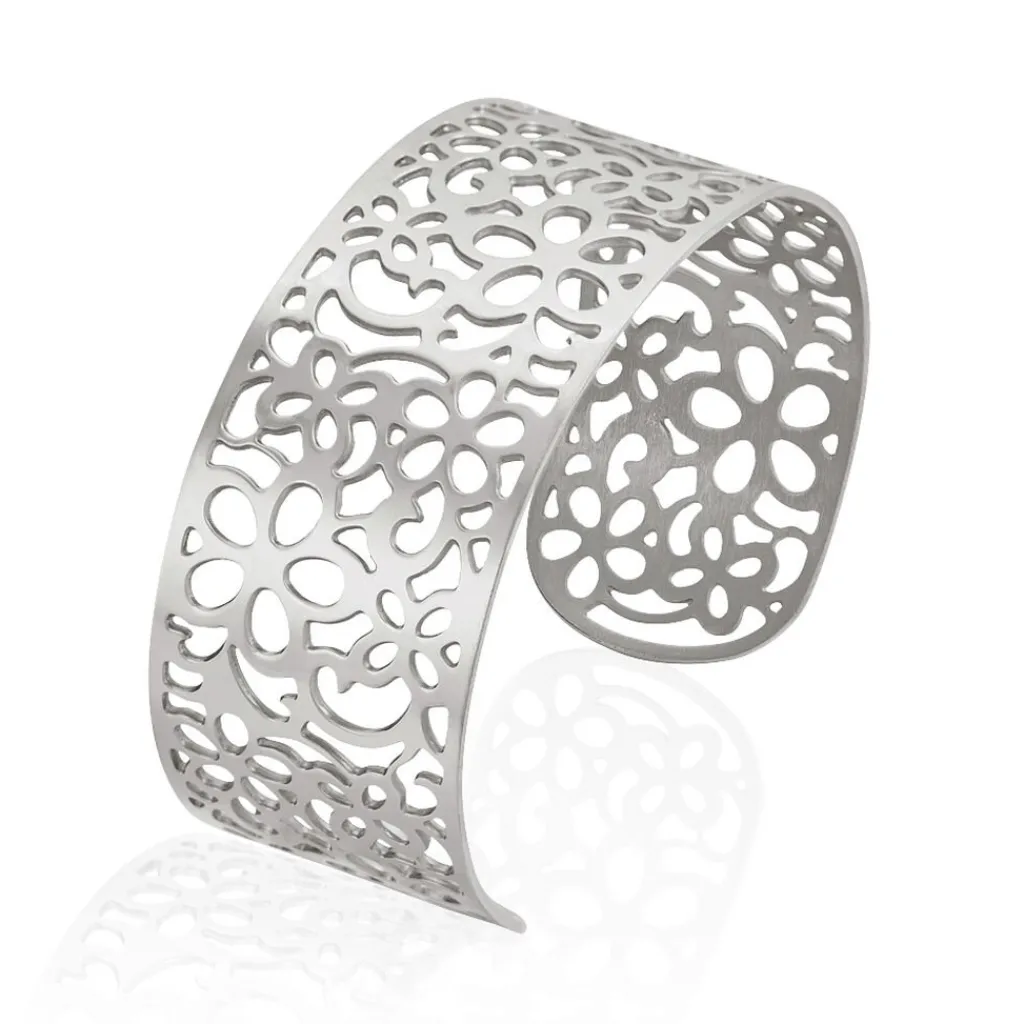 Bracelet Manchette Acier Blanc Fleurs Ajourees
