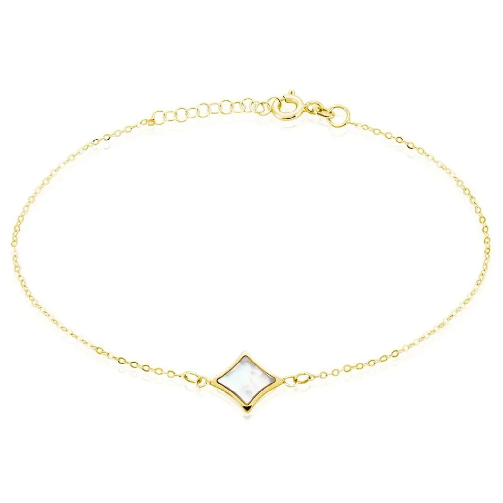 Bracelet Or Jaune 375/1000 Losange Nacre Blanche Serti Clos Maille Forcat 16+2cm