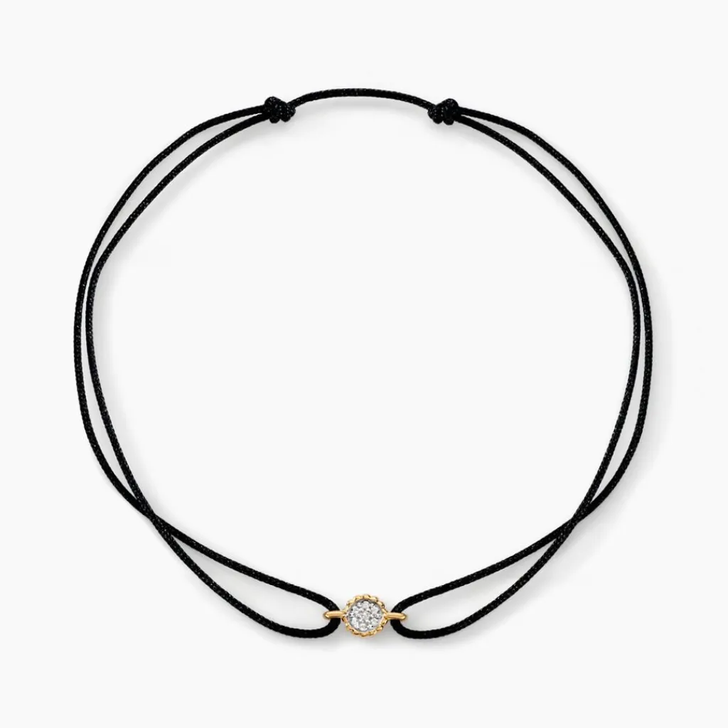 Bracelet Or Jaune 375/1000 Pastille Effet Perlé Et Diamant Cordon Noir Ajustable
