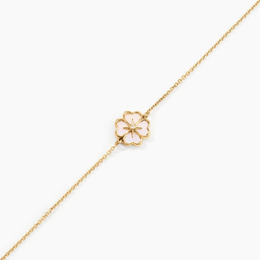 Bracelet Or Jaune 375/1000 Fleur De Trefle Nacre Blanche 1 Oxyde De Zirconium Serti 4 Griffes Maille Jaseron 16+2cm