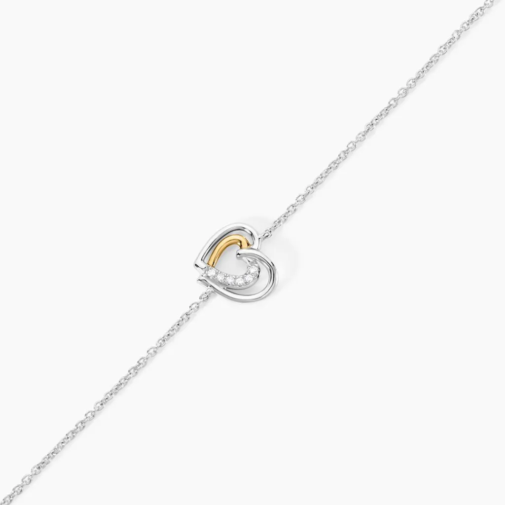 Bracelet Or Jaune 375/1000 Et Argent Blanc 925/1000 Double C艙urs Oxydes De Zirconium Blancs Maille Jaseron 16+3Cm