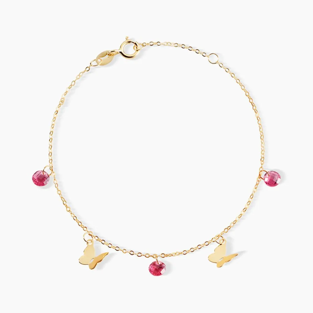 Bracelet Or Jaune 375/1000 Pampille Papillons Et Oxydes De Zirconium Roses Perces Maille Forcat Ronde 14+2cm