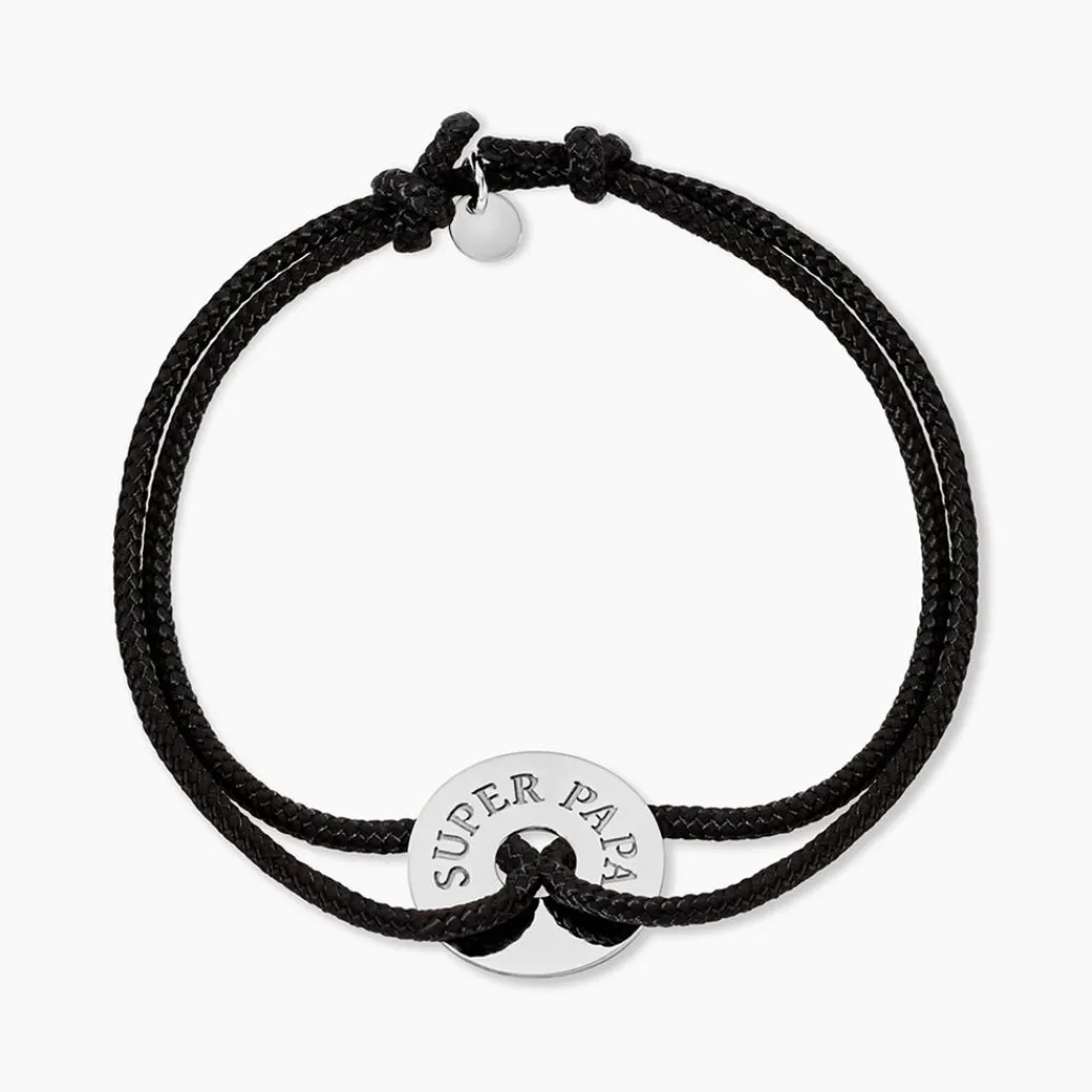 Bracelet Argent Blanc 925/1000 Cercle Gravé Super Papa Cordon Noir 19cm