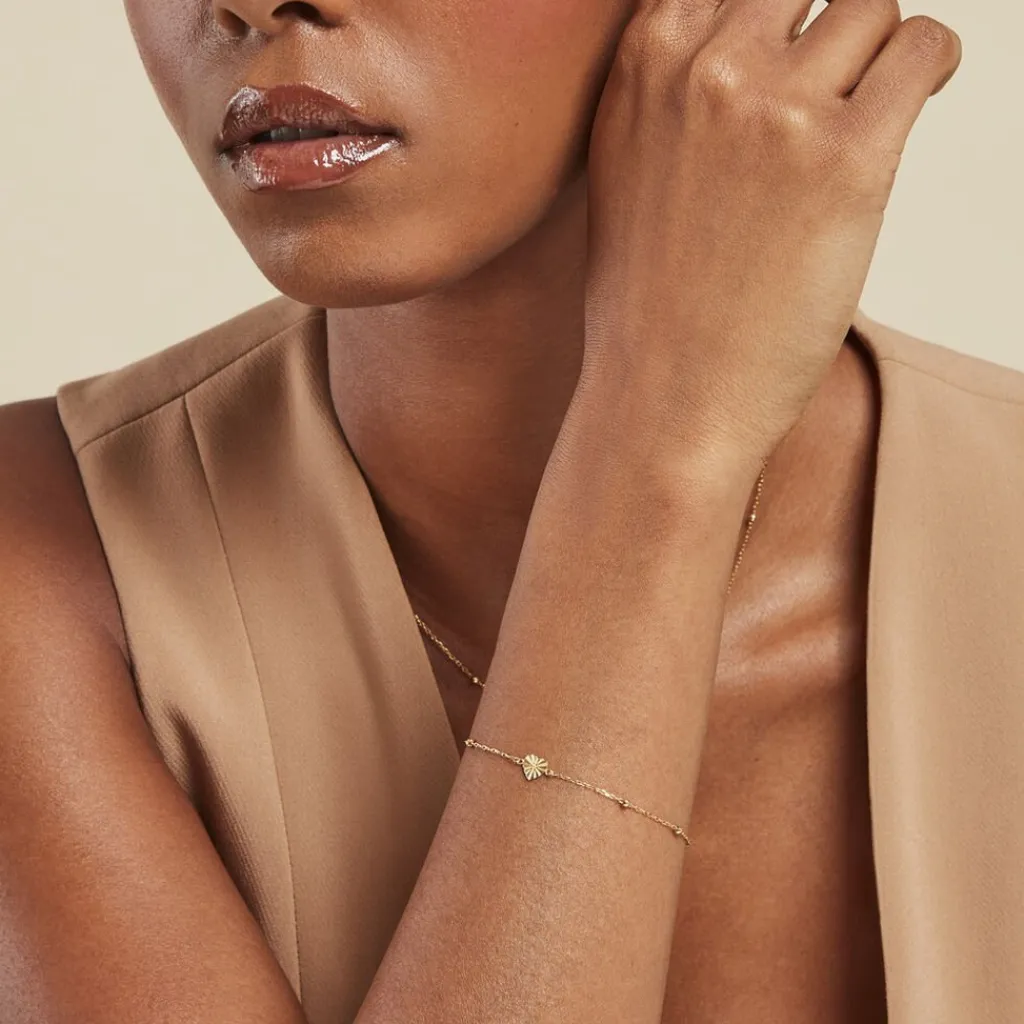 Bracelet Or Jaune 375/1000 C艙ur Strie Boules Maille Jaseron 16+2cm