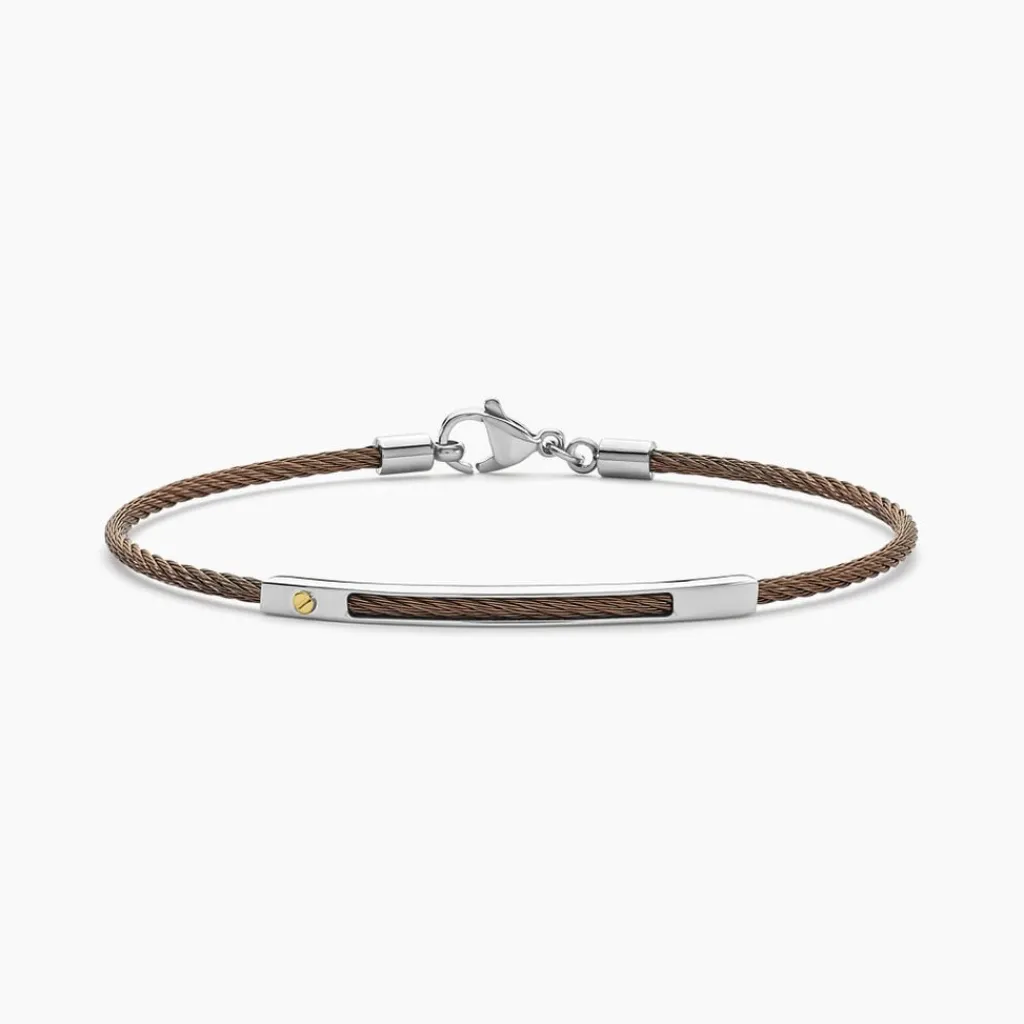 Bracelet Acier Inoxydable Blanc Plaque Rectangulaire Ajourée Vis Jaune Et Câble Marron 19cm