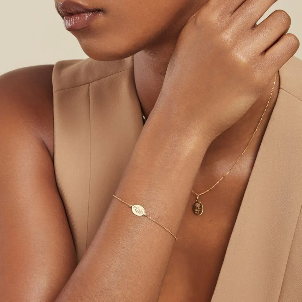 Bracelet Or Jaune 375/1000 Pastille Ovale Fleur Maille Jaseron 16+2cm