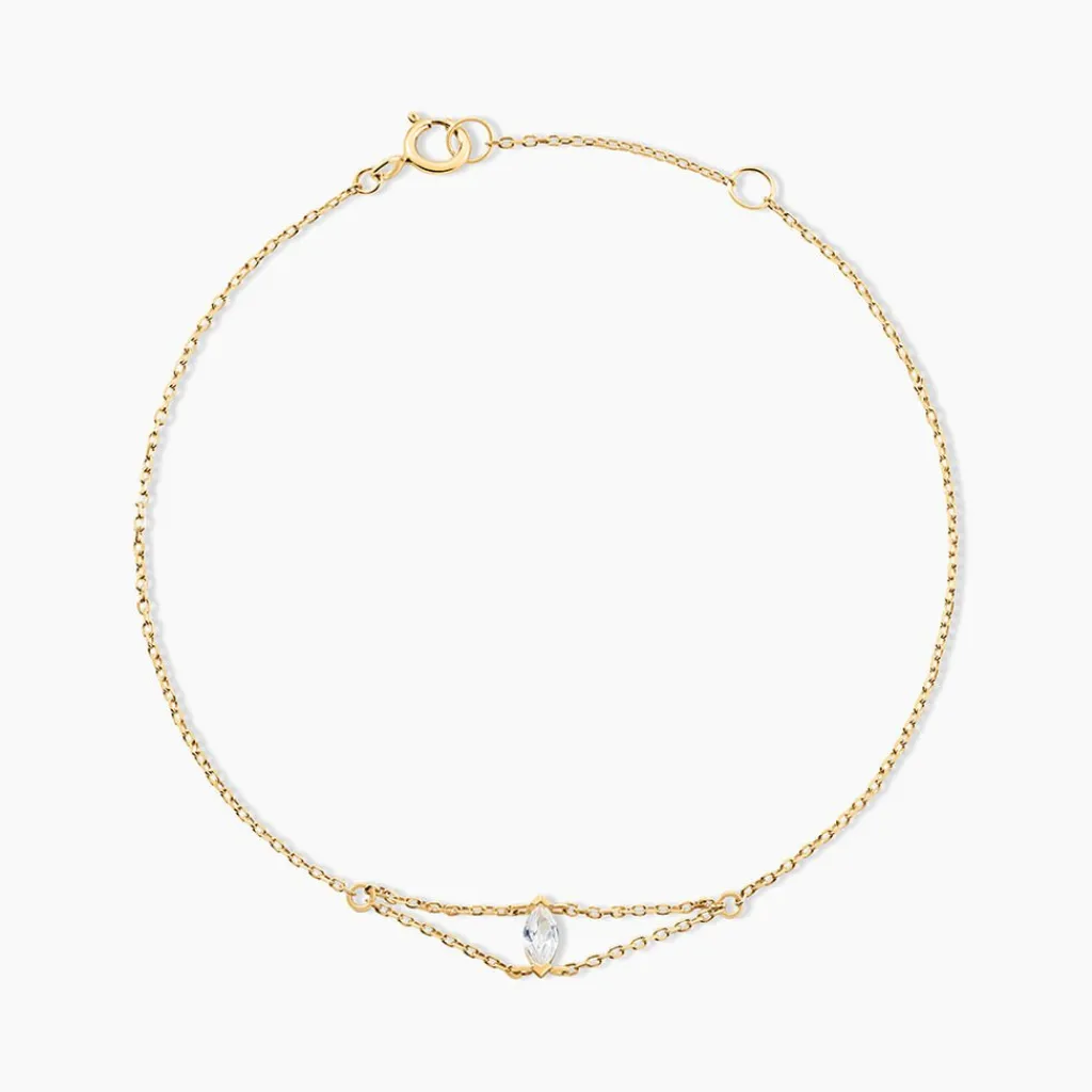 Bracelet Or Jaune 375/1000 Jamsheed Solitaire Navette Oxyde Double Chaine Maille Forcat 16+2Cm BNH0015K-G-CZ-S1