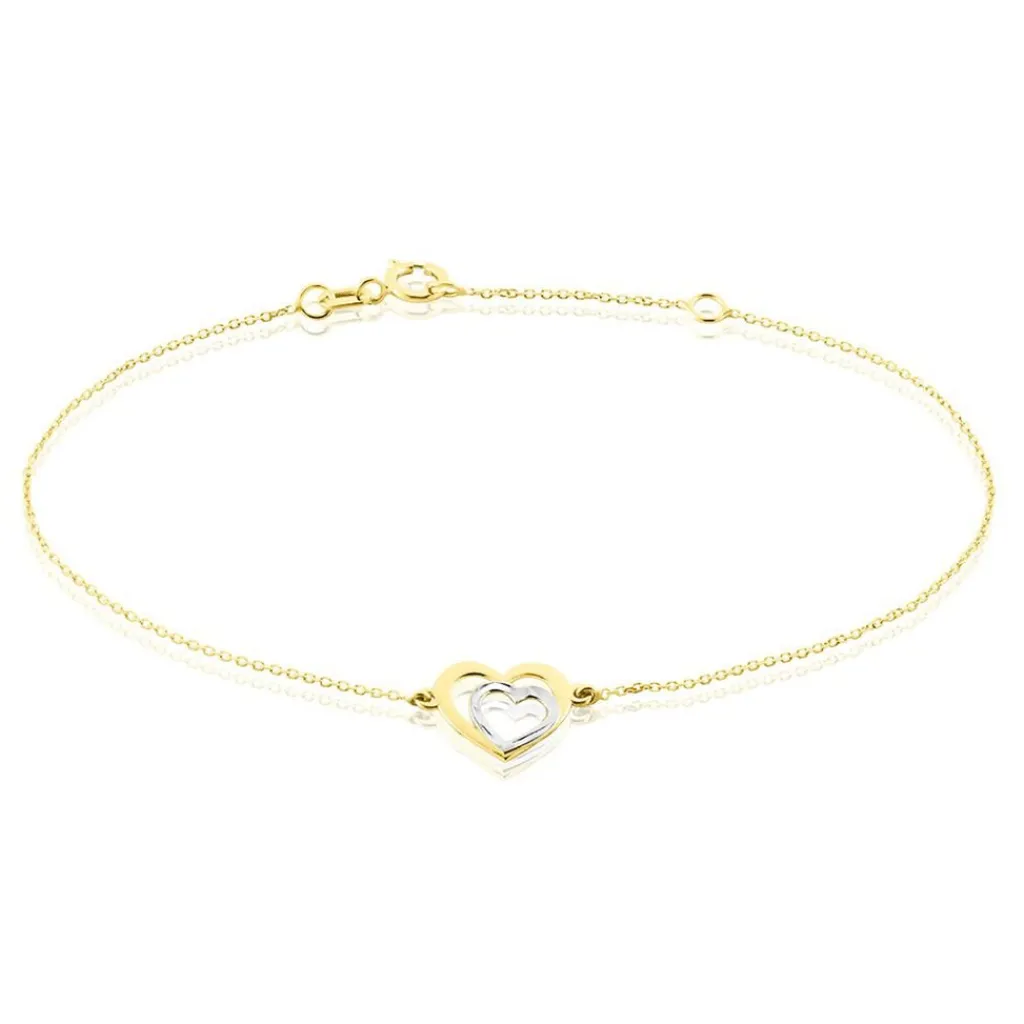 Bracelet Or Jaune 375/1000 Double C艙urs Ajoures Avec Un C艙ur Effet Diamante Argente Maille Jaseron 16+2cm