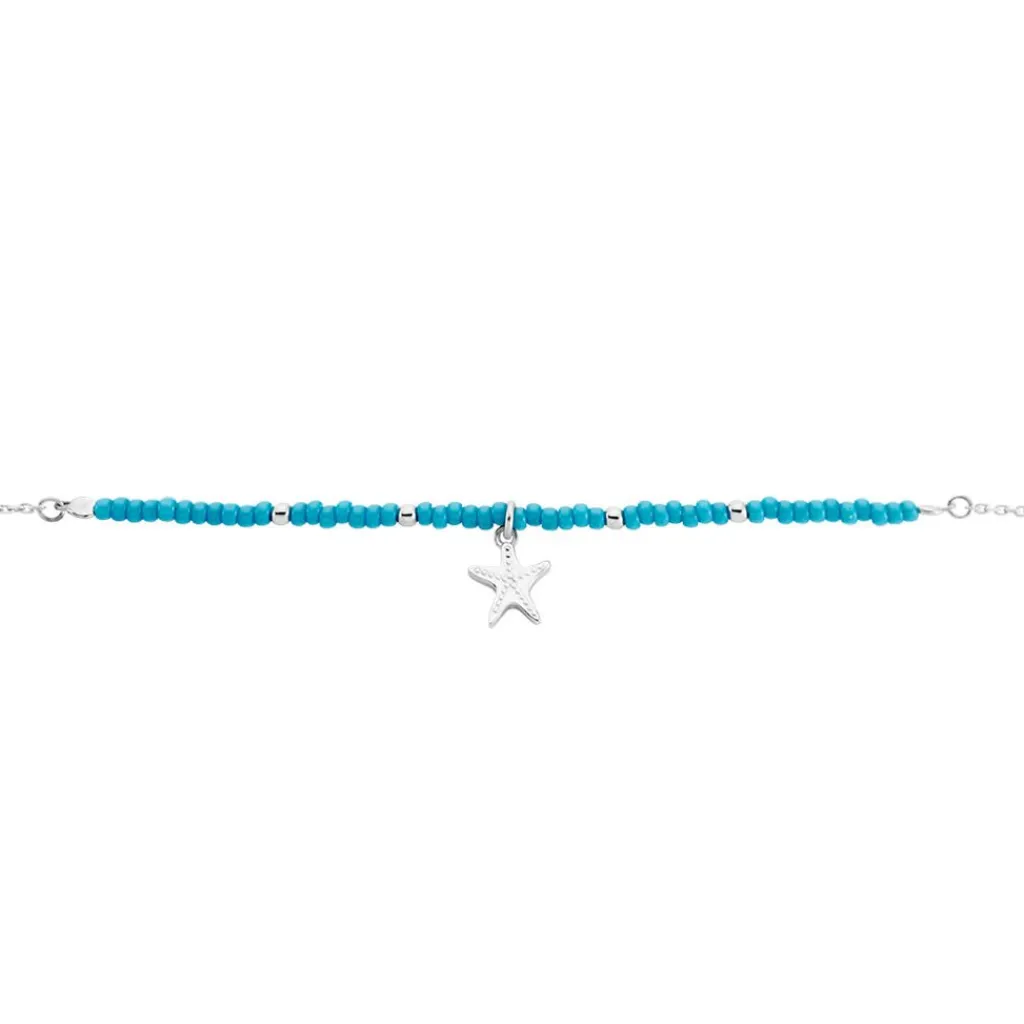 Chaîne De Cheville Argent Blanc 925/1000 Pampille Etoile De Mer Perles De Miyuki Bleues Et Boules Argent Maille Forçat 25cm