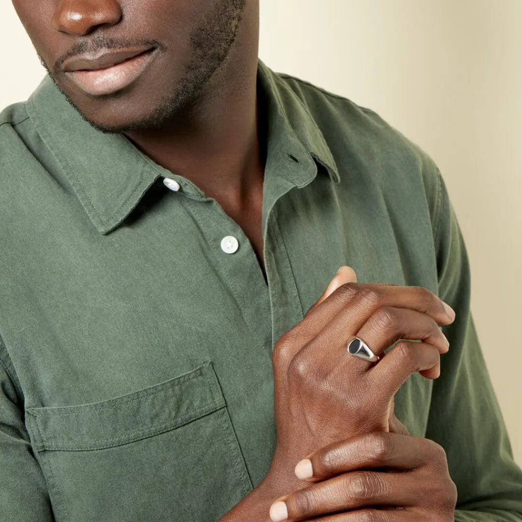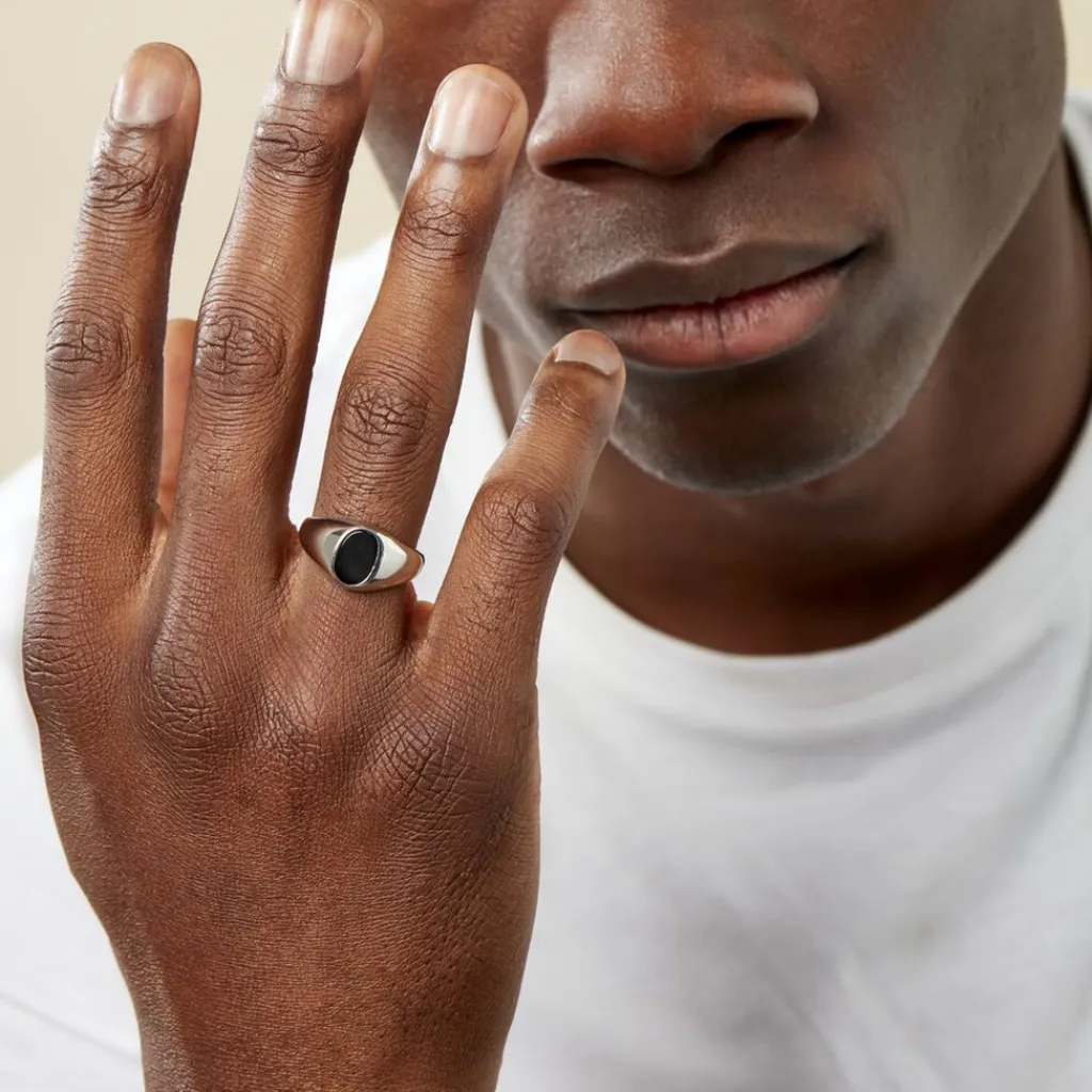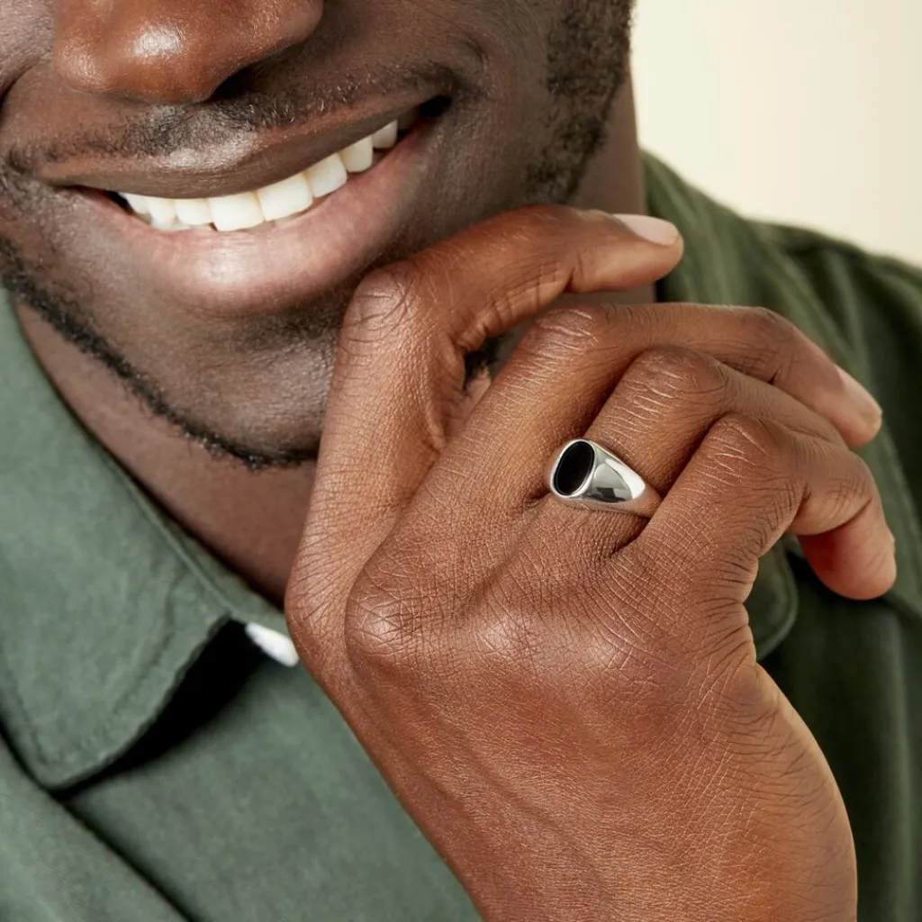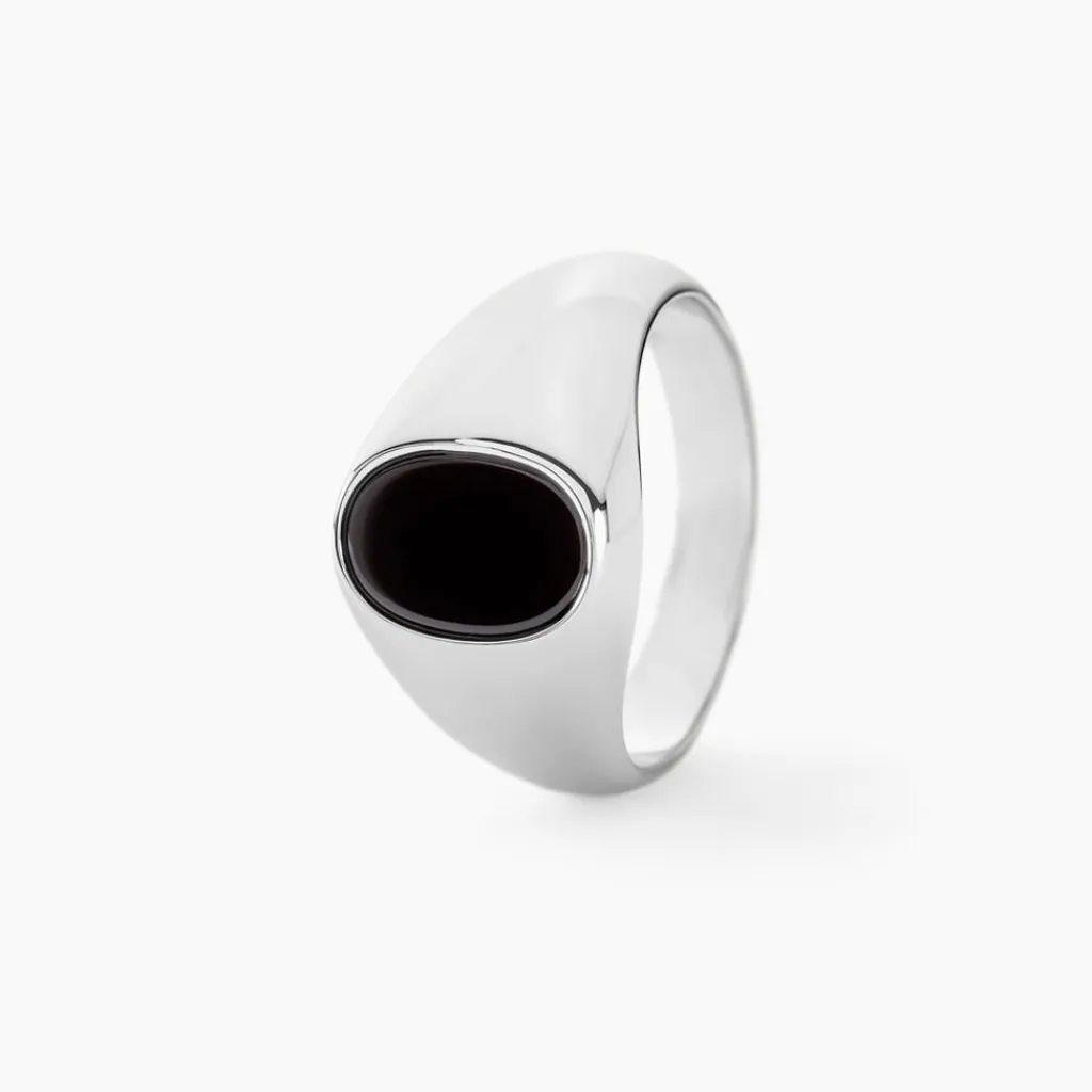 Chevaliere Argent Blanc 925/1000 Plateau Ovale Pierre Noire