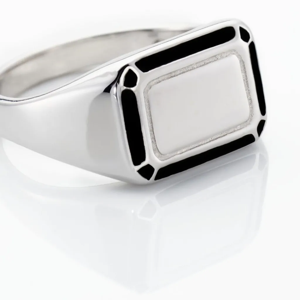 Chevalière Argent 925/1000 Forme Rectangulaire Liseret Email Noir