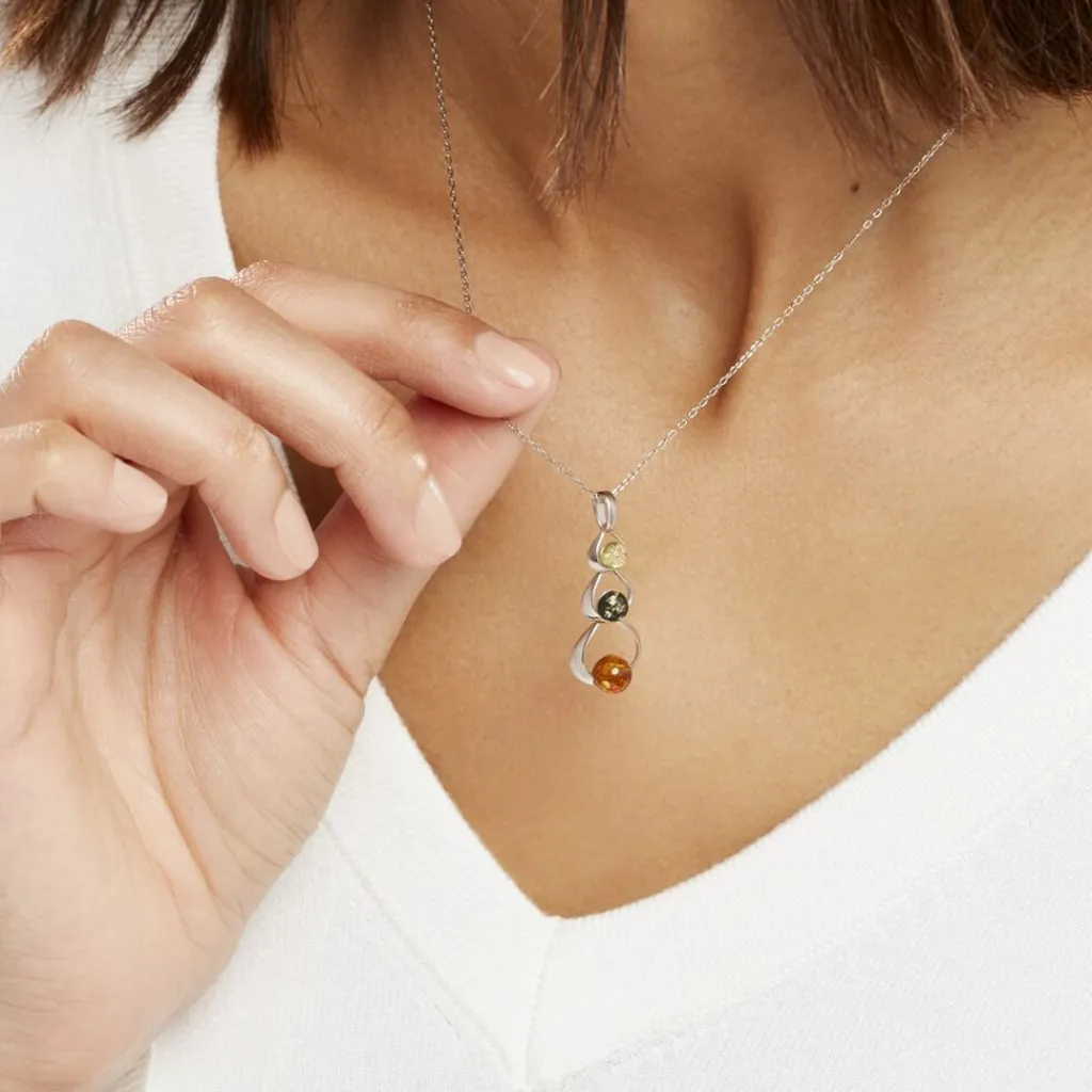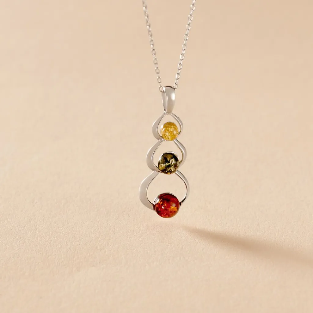 Collier Argent Blanc 925/1000 Trois Cercles Ambres Multicolores Verte/miel/cognac 45cm