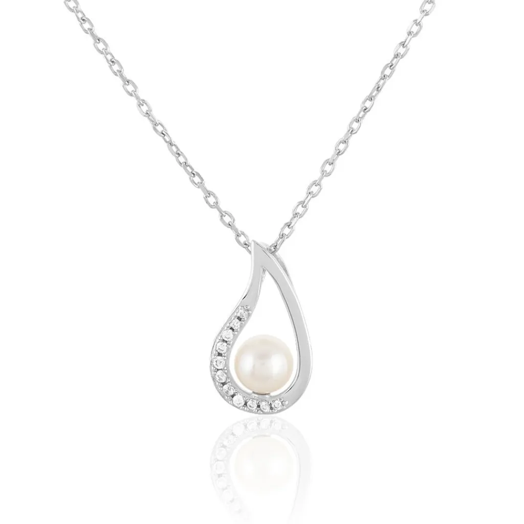 Collier Argent Blanc 925/1000 Motif Coquillage Et Perle De Culture Pavage Oxydes De Zirconium 45cm