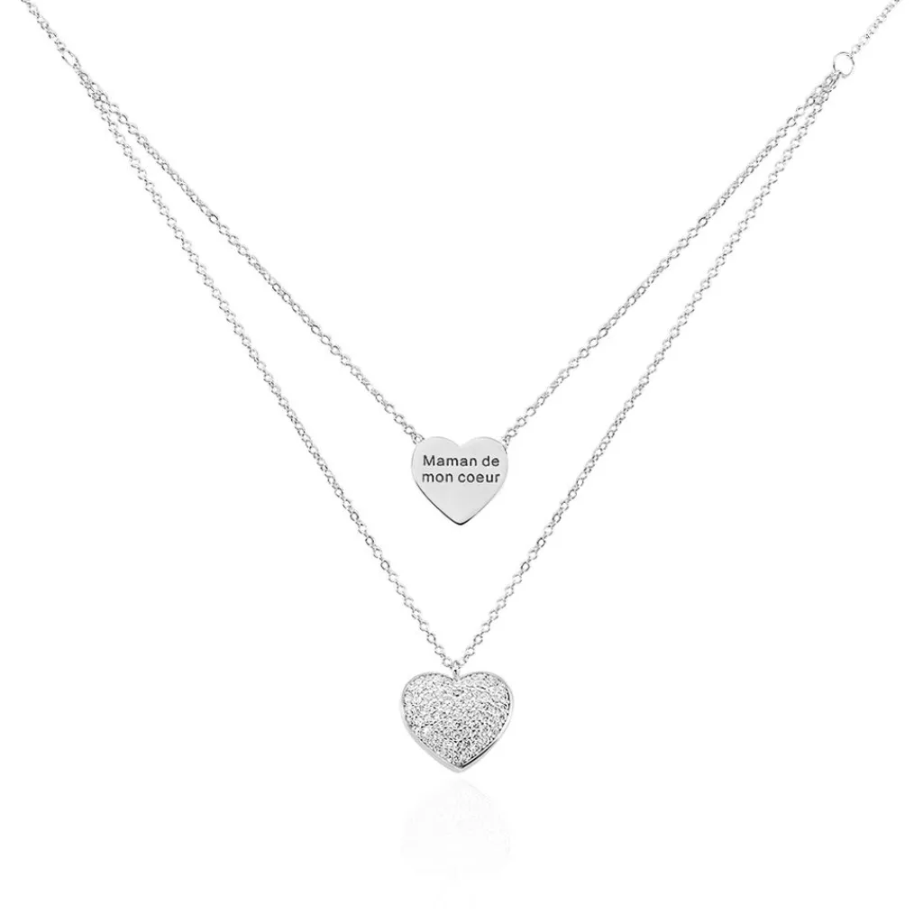 Collier Argent 925/1000 Double Chaines Motifs C艙ur Pavage Oxydes De Zirconium Et C艙ur Message 45cm