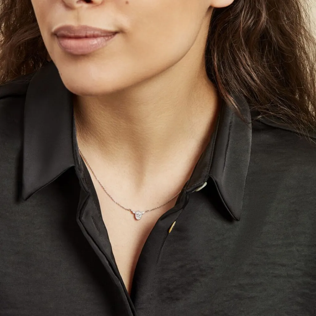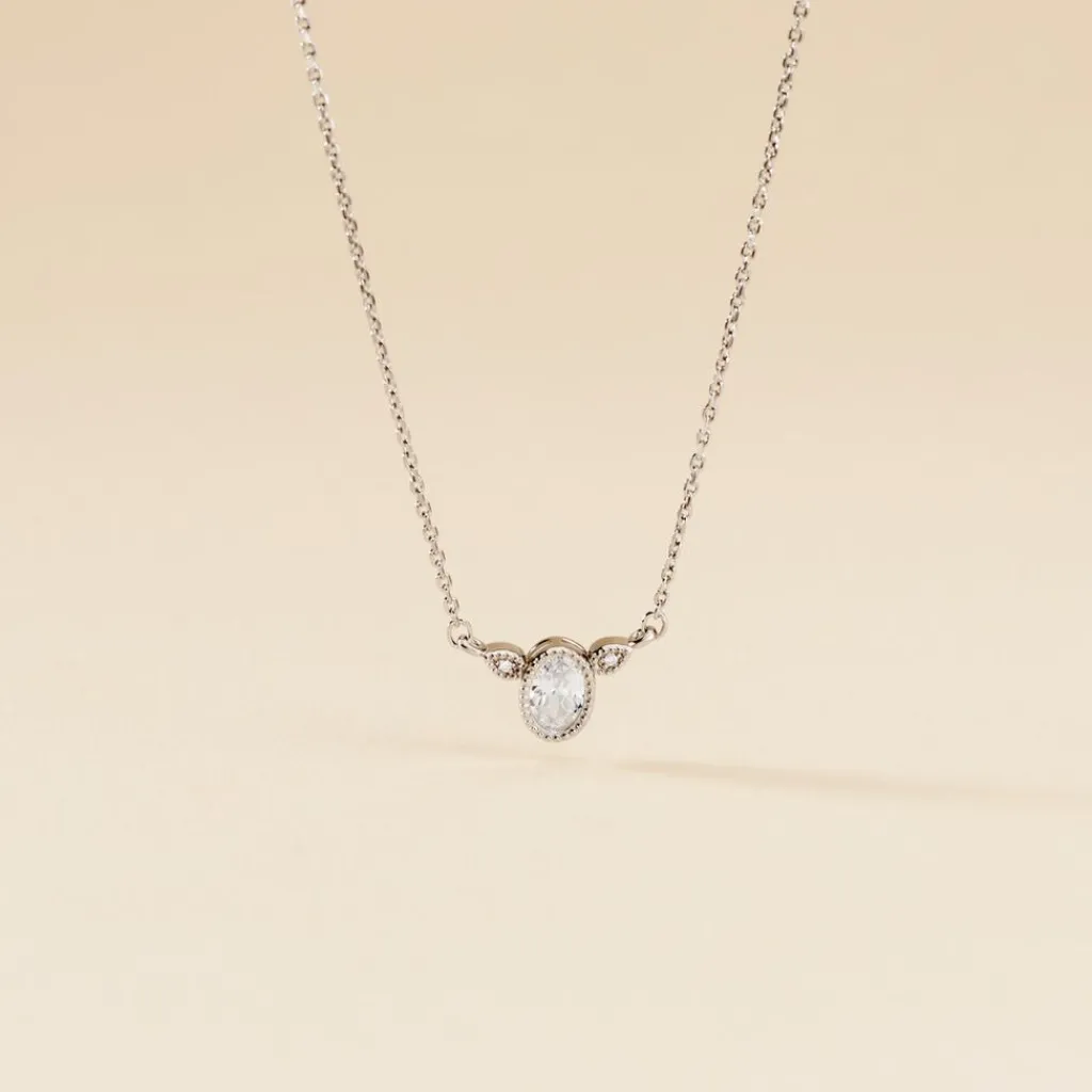 Collier Argent Blanc 925/1000 Oxyde De Zirconium Ovale Accompagné Serti Clos Effet Perlé 45cm