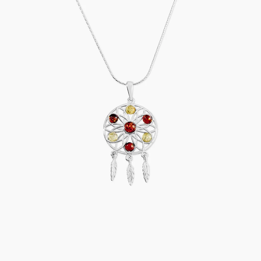 Collier Argent Blanc 925/1000 Motif Attrape Reve Ambre Cognac/miel 42cm