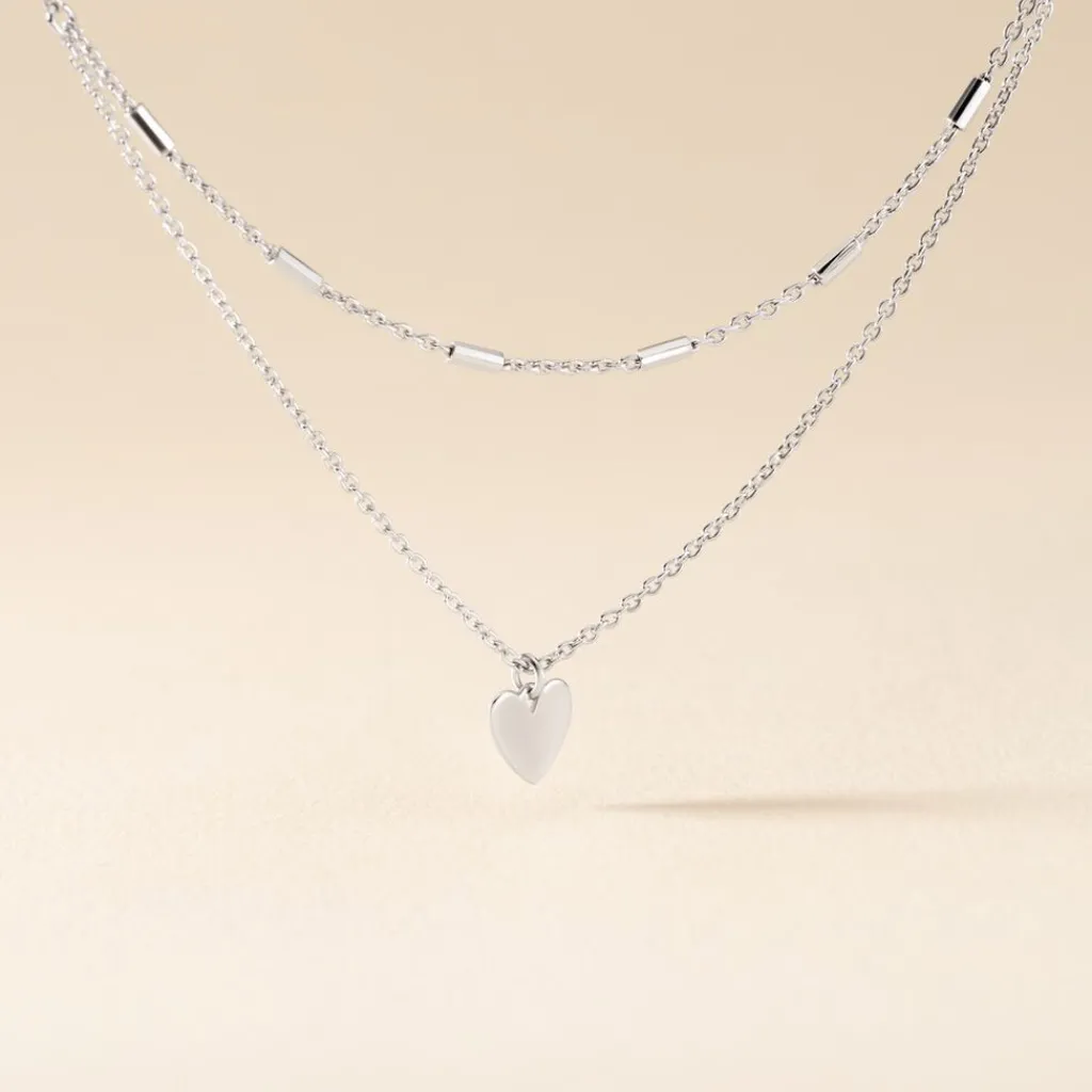 Collier Argent Blanc 925/1000 C艙ur Double Mailles Forcat Et Fantaisie 45cm
