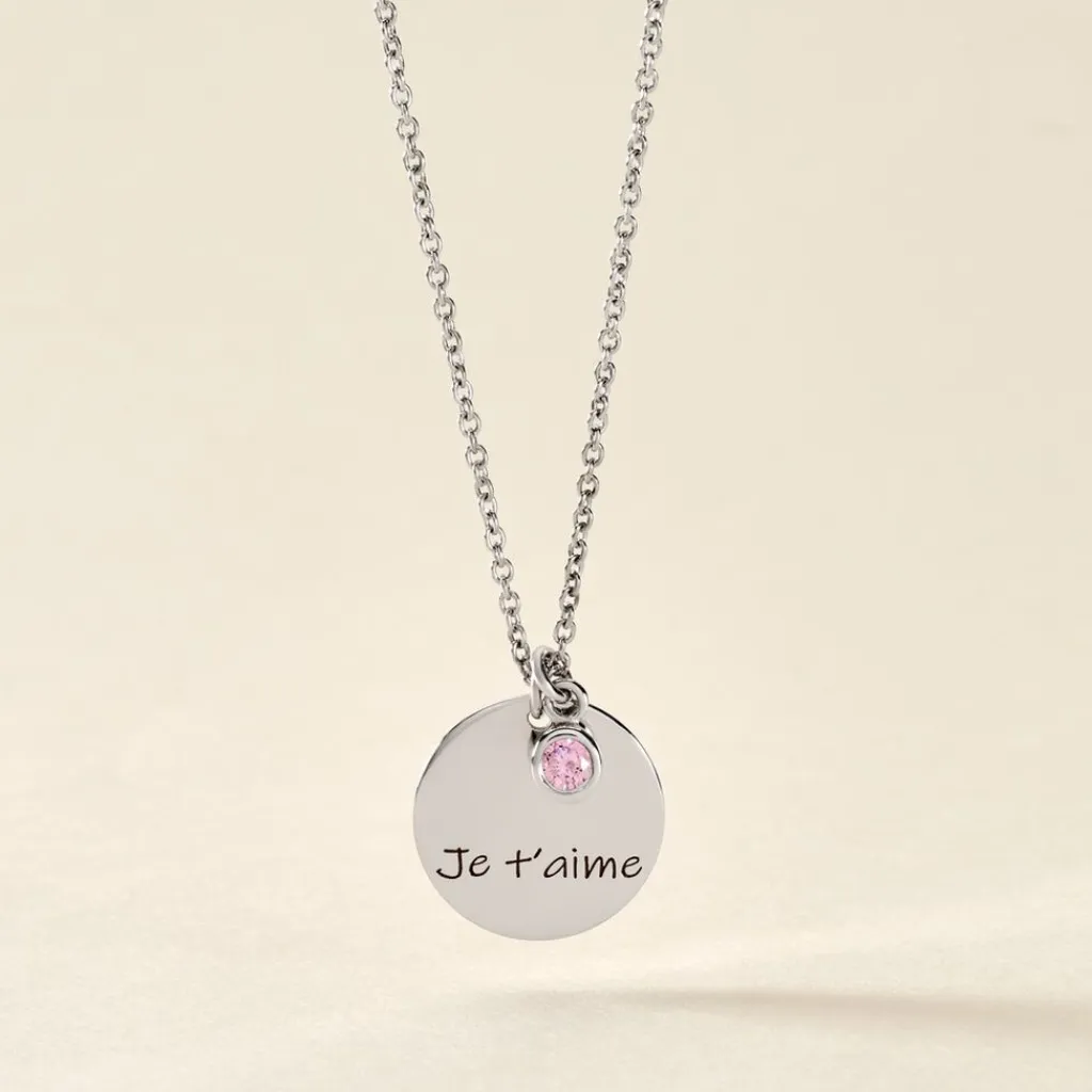 Collier Argent 925/1000 Pastille Gravée Je T’aime Pampille Oxyde De Zirconium Rose Maille Forçat 45cm