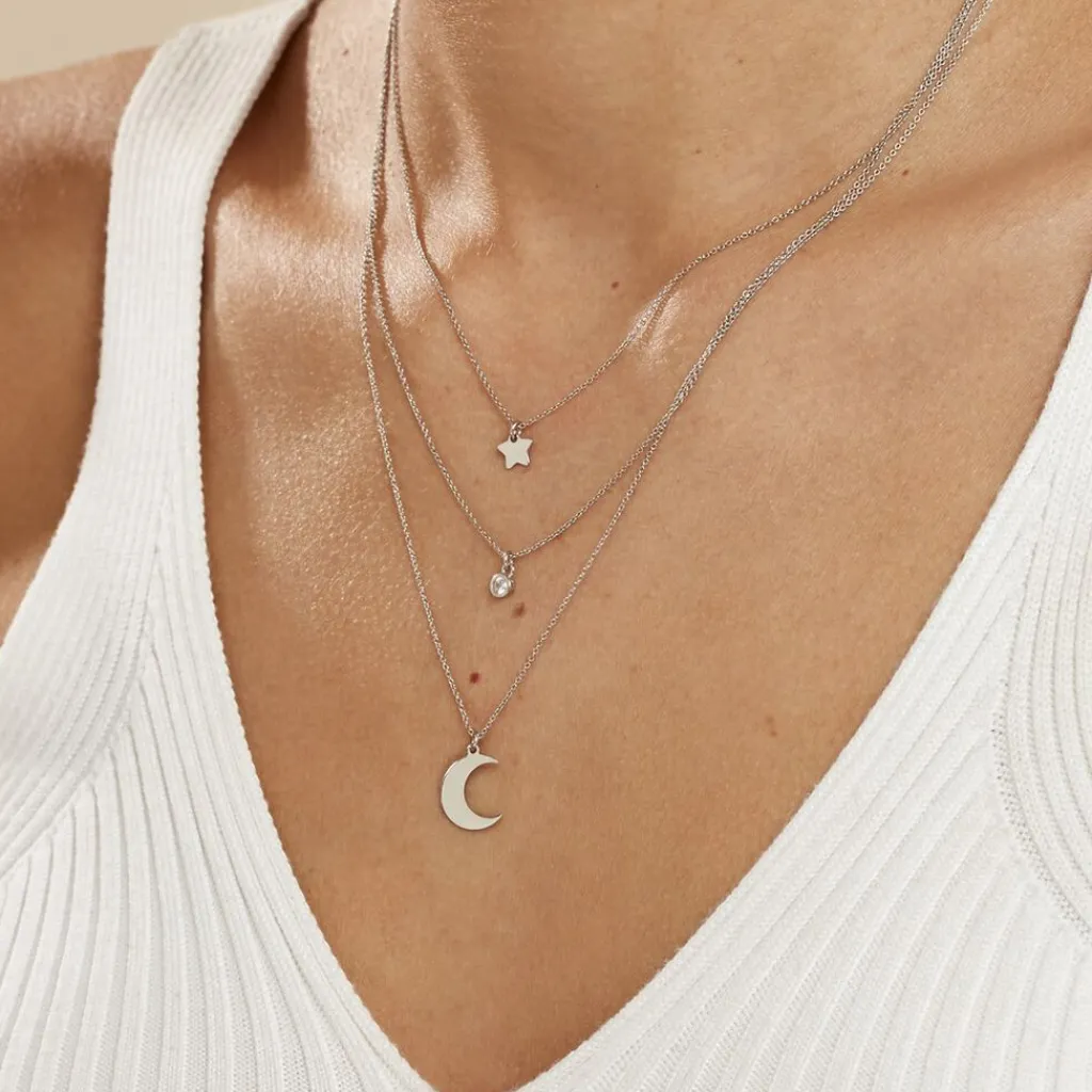 Collier Argent Blanc 925/1000 Lune. Etoile Et Oxyde De Zirconium Triple Mailles Forcat 41cm